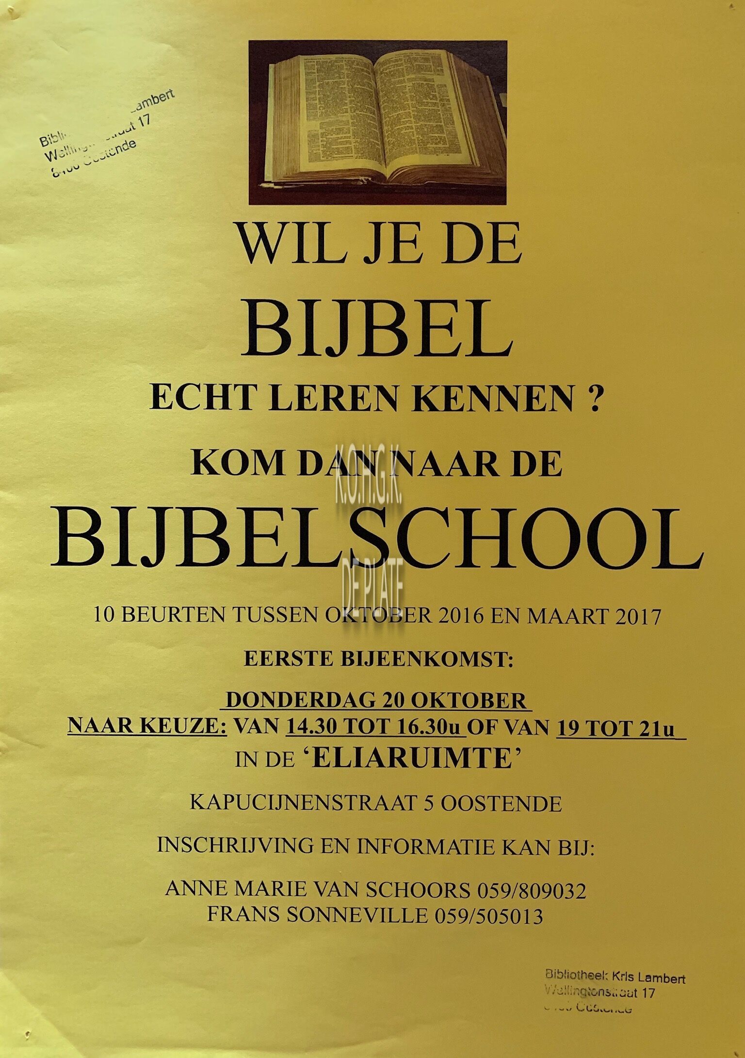 Omschrijving Formaat : 42 x 30 cm. - Eliaruimte. Kapucijnenstraat 5, Oostende Trefwoorden AFFICHES BIJBELSCHOOL (LANGESTRAAT) KATHOLIEKE KERK ELIARUIMTE (KAPUCIJNENSTRAAT) Plaatskenmerk ZOLDER 301 LKA/02/244/01/2016-2017 Inventarisnummers 2019/2090 10/ 2016 Herkomst BIBLIOTHEEK KRIS LAMBERT Collectie Kerk en Maatschappij Algemeen Print