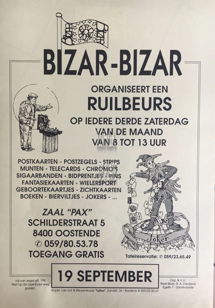 Omschrijving Formaat: 42 x 30 cm. Trefwoorden AFFICHES RUILBEURZEN ZAAL PAX (SCHILDERSSTRAAT) BIZAR BIZAR (VERZAMELVERENIGING) Plaatskenmerk ZOLDER 301 LKA/05/372.6/31/0032 Inventarisnummers 2017/2952 Collectie Markten Beurzen Ruilbeurzen Print