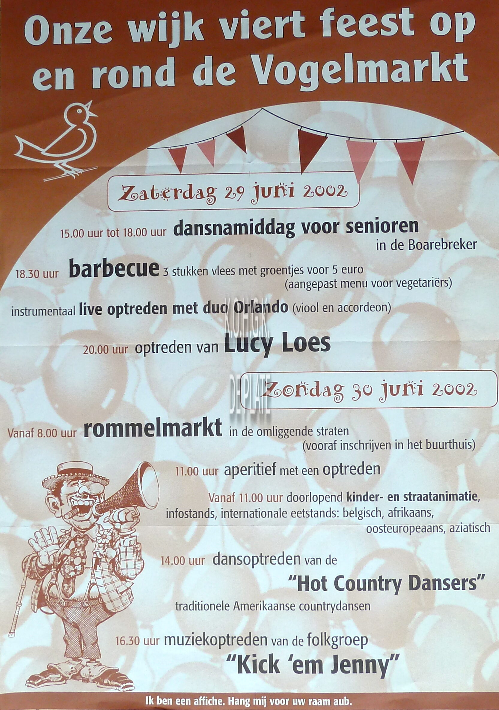 Formaat : 59 x 42 cm. - 29 juni : Dansnamiddag voor senioren, barbecue, live optreden met duo Orlando, Lucy Loes. 30 juni : Rommelmarkt, Hot Country Dansers, muziekoptreden van de folkgroep "Kick 'em Jenny"