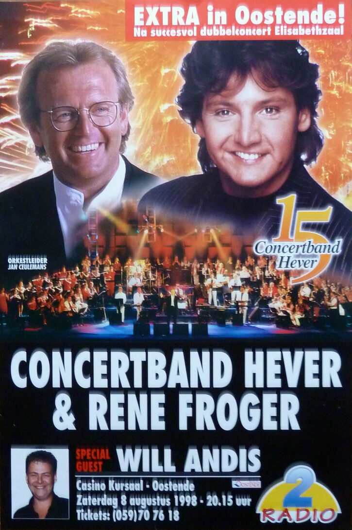 Affiche : Concertband Hever en Rene Froger. Special Guest Will Andis. Casino Kursaal Oostende. 08/08/1998.