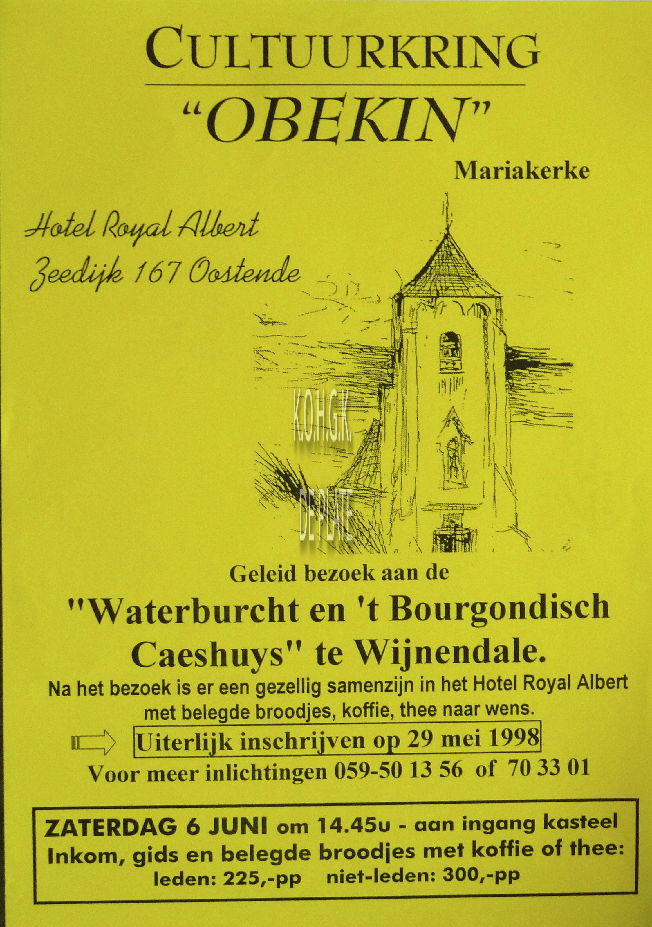 Affiche : Cultuurkring Obekin. Bezoek "Waterburcht en 't Bourgondisch Caeshuys te Wijnendale". Hotel Royal Albert. 06/06/1998.