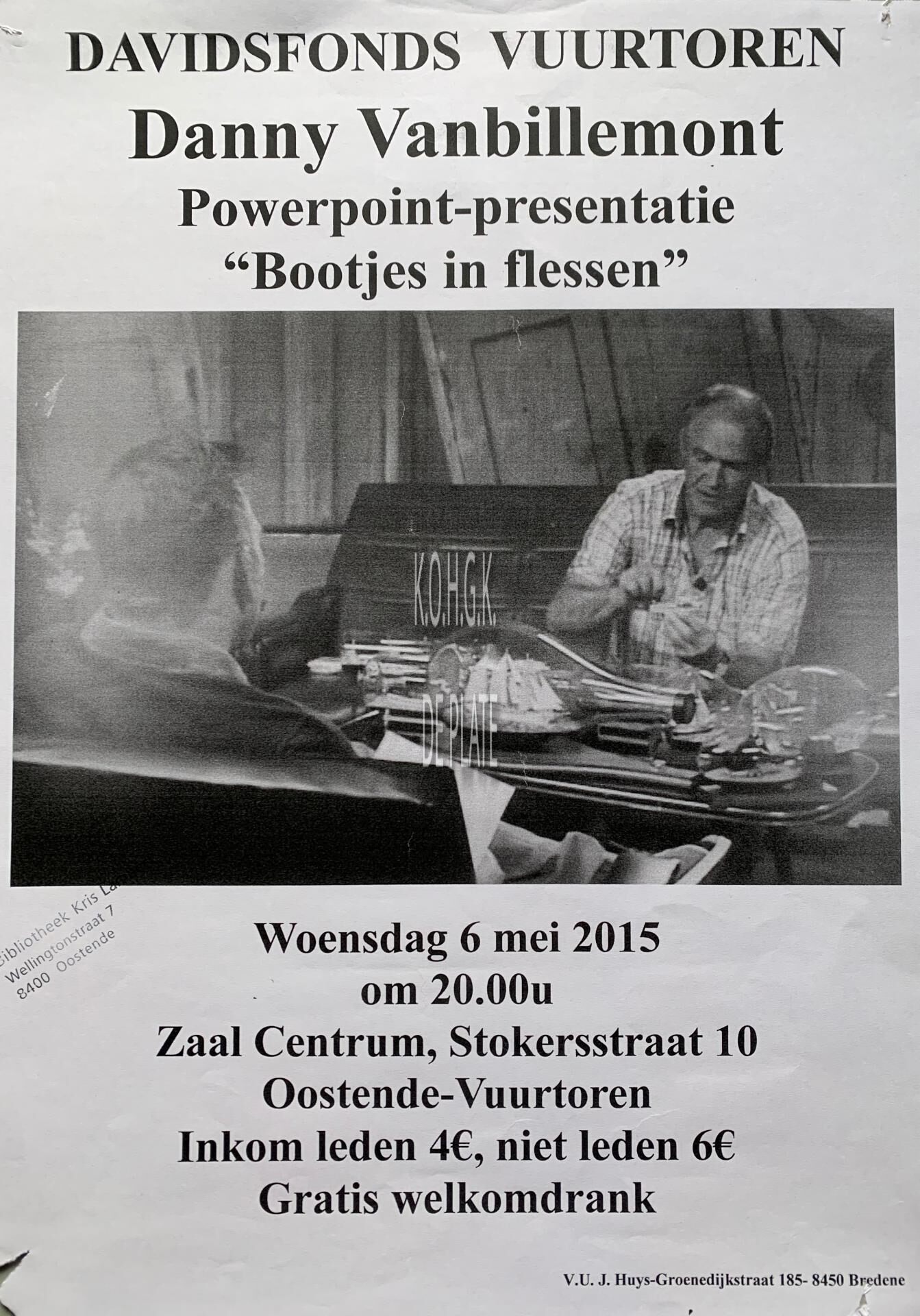 Affiche : Davidsfonds Vuurtoren. Bootjes in flessen. Zaal Centrum. 06/05/2015