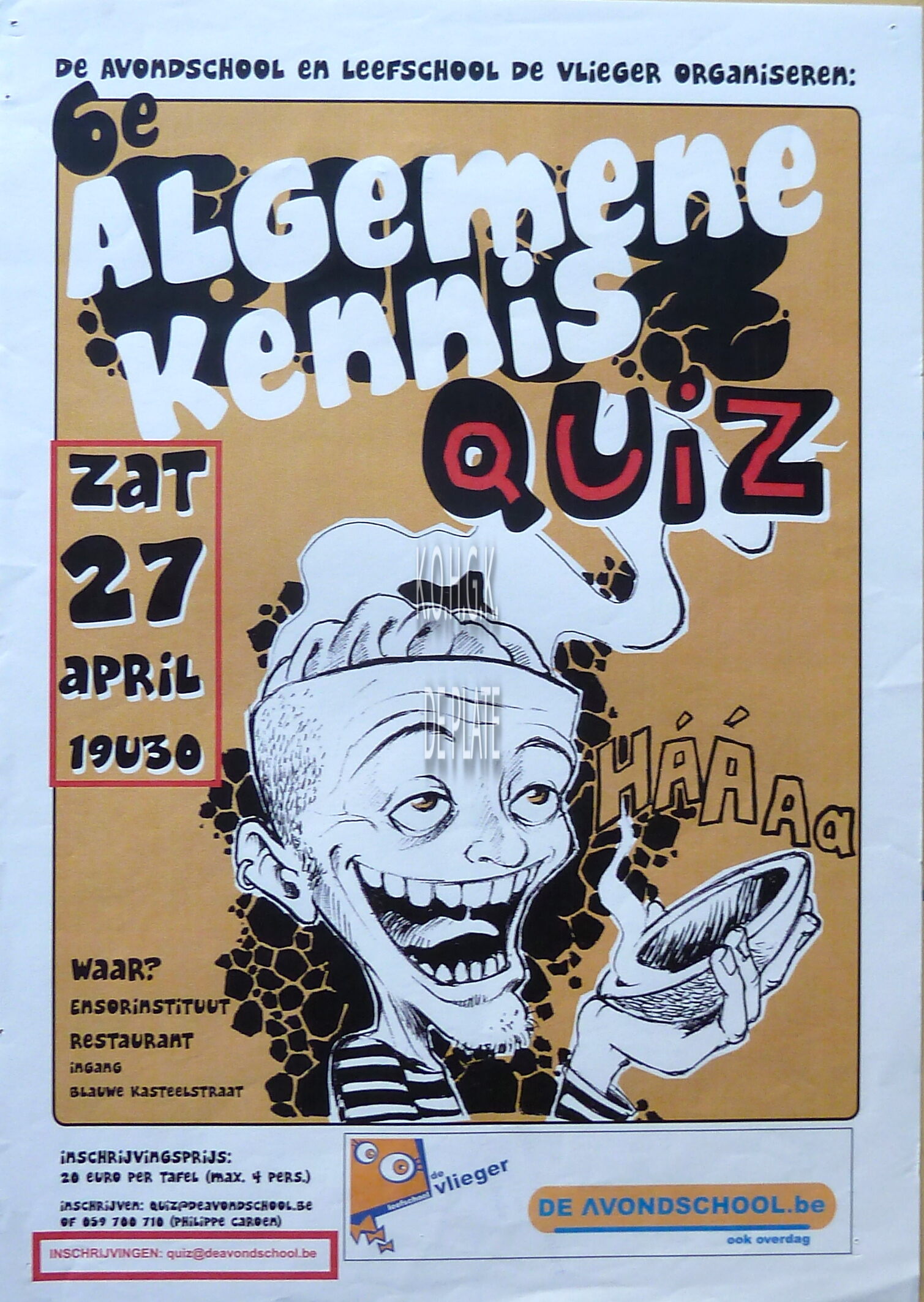 Omschrijving Formaat : 42 x 30 cm. Trefwoorden AFFICHES CVO DE AVONDSCHOOL (ONDERWIJS) LEEFSCHOOL DE VLIEGER QUIZ Plaatskenmerk ZOLDER 301 LKA/16/450/35/0007 Inventarisnummers 2017/2719 Collectie Onderwijs CVO De Avondschool Print