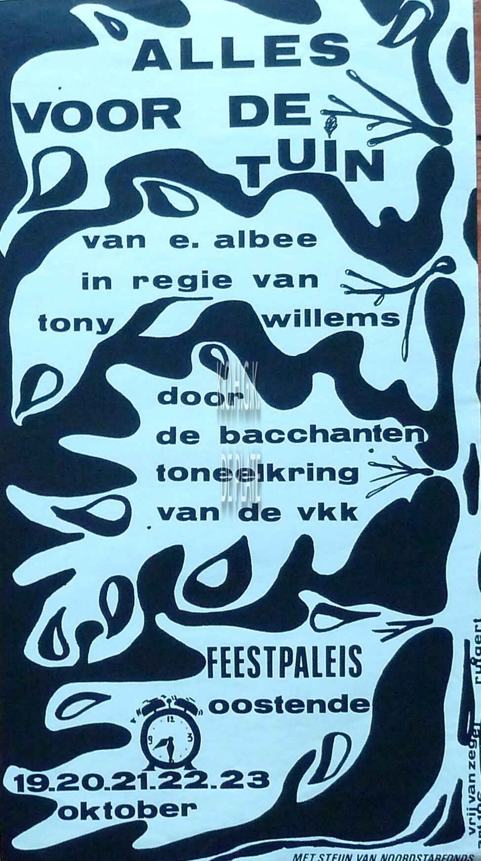 Omschrijving Formaat: 50 x 28 cm. Van E. Albee in regie van Tony Willems. Trefwoorden DE BACCHANTEN (TONEELVERENIGING) TONEELSTUKKEN AFFICHES FEEST- EN CULTUURPALEIS ; TONEEL ALLES VOOR DE TUIN (EVERYTHING IN THE GARDEN) (TONEELSTUK) WILLEMS TONY (REGISSEUR) ALBEE EDWARD (1928-2016) (TONEELSCHRIJVER) Plaatskenmerk ZOLDER 301 LKA/14/792/34/0011 Inventarisnummers 2012/2678 Vervaardiger Rutgert Collectie Toneel De Bacchanten Print