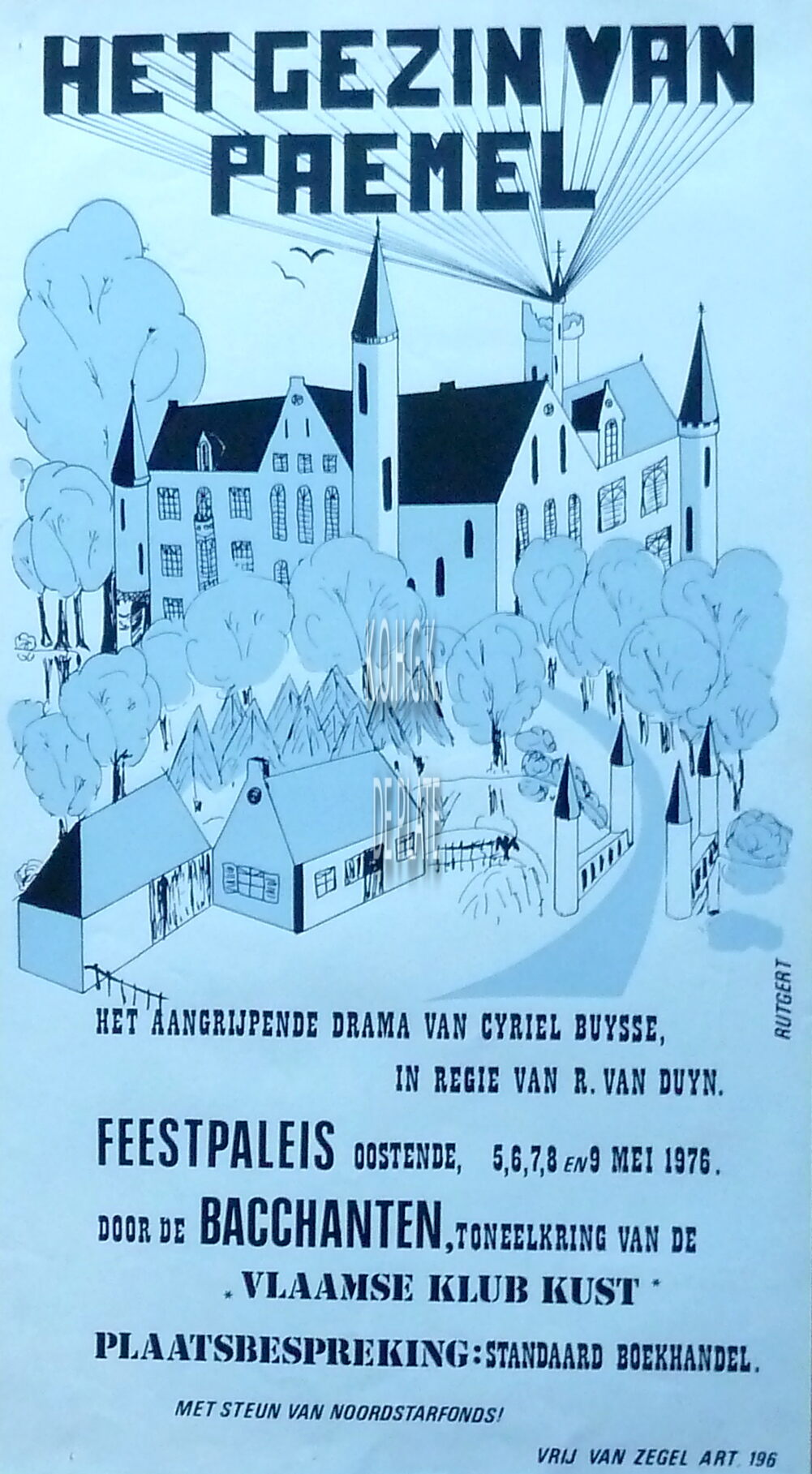 Omschrijving Formaat: 55 x 30 cm. Het aangrijpende drama van Cyriel Buysse, in regie van R. Van Duyn. Trefwoorden DE BACCHANTEN (TONEELVERENIGING) TONEELSTUKKEN AFFICHES FEEST- EN CULTUURPALEIS ; TONEEL HET GEZIN VAN PAEMEL (TONEELSTUK) BUYSSE CYRIEL (1859-1932) (AUTEUR) VAN DUYN REMI (REGISSEUR) Plaatskenmerk ZOLDER 301 LKA/14/792/34/1976 Inventarisnummers 2012/2693 05/ 1976 Vervaardiger Rutgert Collectie Toneel De Bacchanten Print