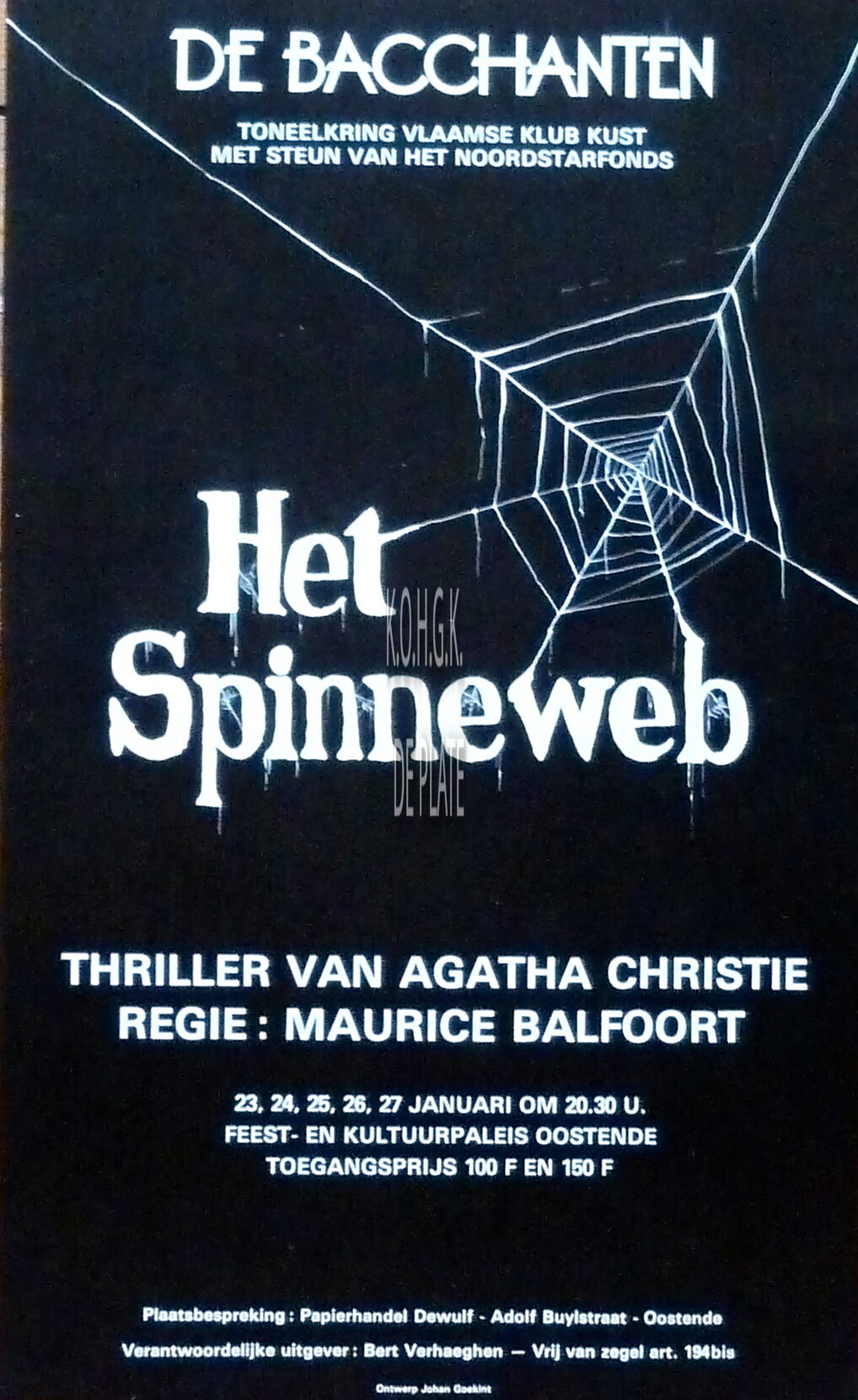 Omschrijving Formaat: 41 x 25 cm. Thriller van Agatha Christie. Regie: Maurice Balfoort. Trefwoorden DE BACCHANTEN (TONEELVERENIGING) TONEELSTUKKEN AFFICHES FEEST- EN CULTUURPALEIS ; TONEEL CHRISTIE AGATHA (1890-1976) (AUTEUR) BALFOORT MAURICE (1905-1989) (REGISSEUR) HET SPINNEWEB (TONEELSTUK) Plaatskenmerk ZOLDER 301 LKA/14/792/34/0013 Inventarisnummers 2012/2680 Uitgever Verhaeghen Bert Vervaardiger Johan Goekint Collectie Toneel De Bacchanten Print