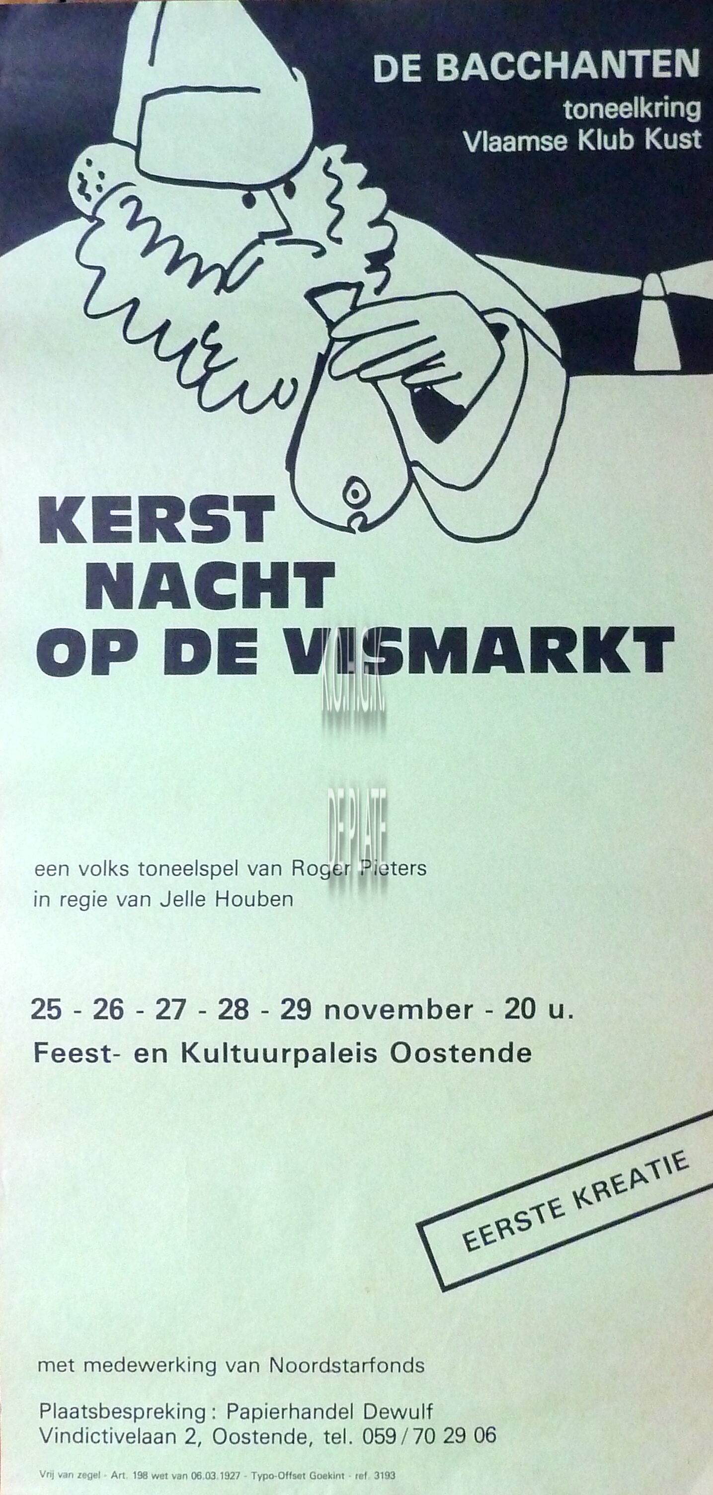 Formaat : 60 x 29 cm. Een volks toneelspel van Roger Pieters in regie van Jelle Houben Met medewerking van het Noordstarfonds. Toneelkring Vlaamse Klub Kust.