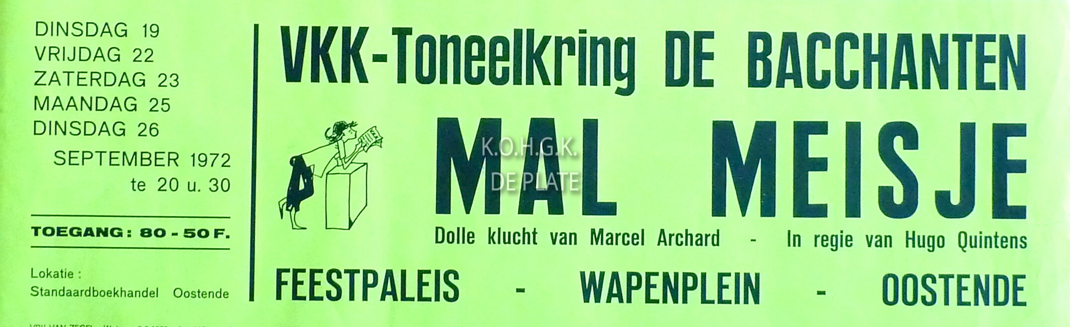 Omschrijving Formaat: 64 x 45 cm. L'idiote. Dolle klucht van Marcel Achard. Regie: Hugo Quintens. Trefwoorden DE BACCHANTEN (TONEELVERENIGING) TONEELSTUKKEN AFFICHES FEEST- EN CULTUURPALEIS ; TONEEL MAL MEISJE (L'IDIOTE) (TONEELSTUK) ACHARD MARCEL (1899-1974) (AUTEUR) QUINTENS HUGO (TONEELSPELER TONEELREGISSEUR) Plaatskenmerk ZOLDER 301 LKA/14/792/34/1972 Inventarisnummers 2012/2684 2012/2685 2012/2688 09/ 1972 Uitgever Drukkerij Goekint Vervaardiger Willy Bosschem (Oostende) Collectie Toneel De Bacchanten Print