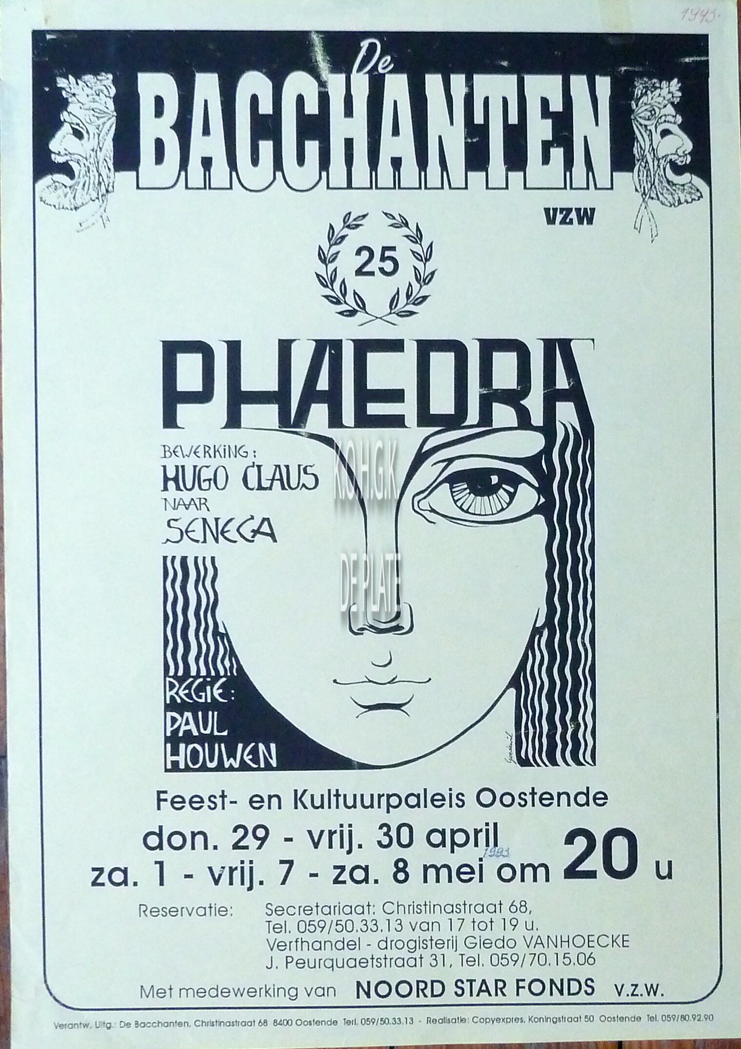 Omschrijving Formaat : 42 x 30 cm. Bewerking : Hugo Claus. Naar Seneca. Regie : Paul Houwen. Met medewerking van Noordstarfonds v.z.w. Trefwoorden DE BACCHANTEN (TONEELVERENIGING) TONEELSTUKKEN AFFICHES FEEST- EN CULTUURPALEIS ; TONEEL PHAEDRA (TONEELSTUK) CLAUS HUGO (1929-2008) (AUTEUR KUNSTSCHILDER FILMMAKER) HOUWEN PAUL (TONEELREGISSEUR) SENECA (AUTEUR FILOSOOF) Plaatskenmerk ZOLDER 301 LKA/14/792/34/1993 Inventarisnummers 2013/1569 1993 Uitgever De Bacchanten Collectie Toneel De Bacchanten Print