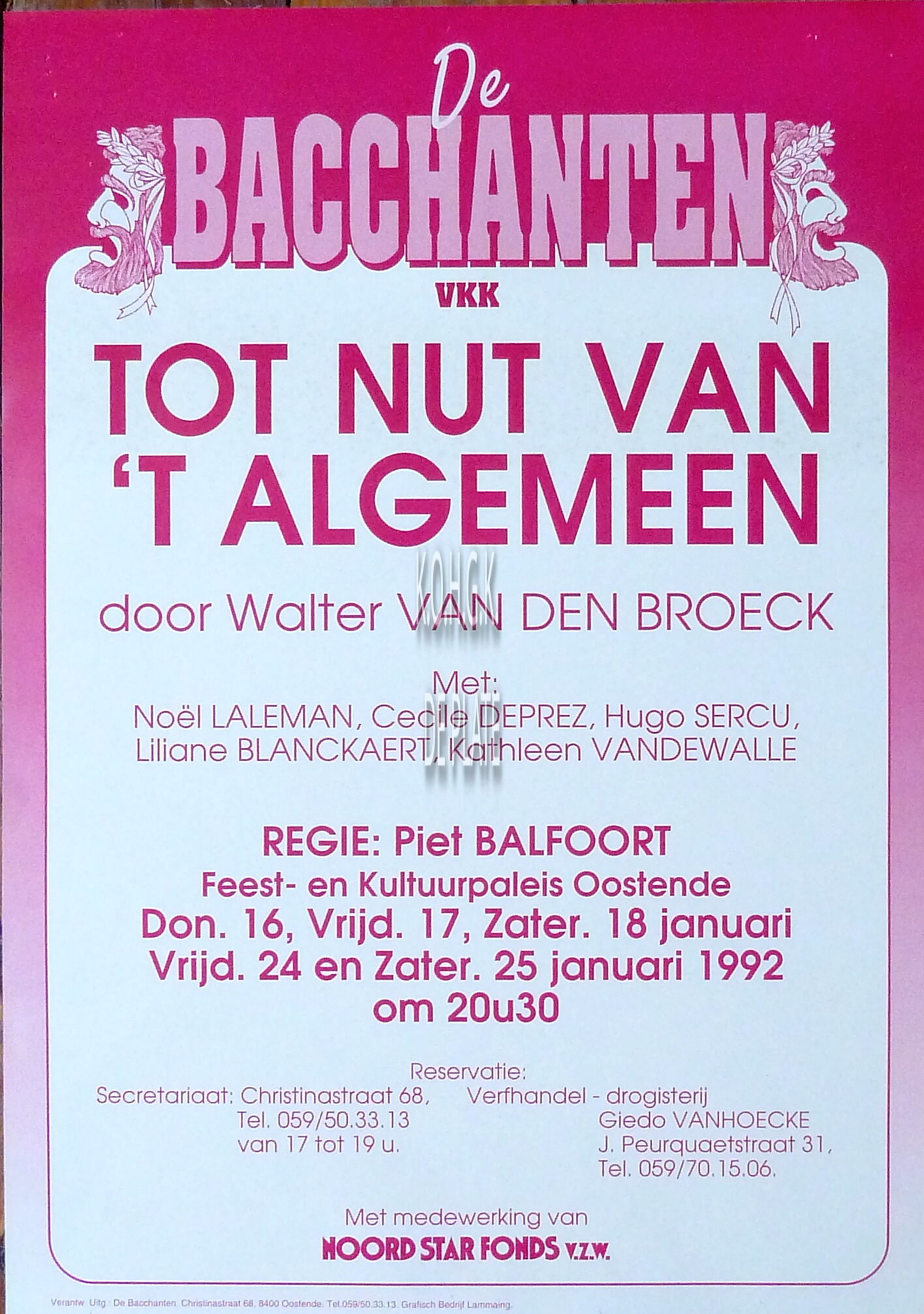 Formaat : 43 x 30 cm. Door Walter Van Den Broeck. Met : Noël Laleman, Cecile Deprez, Hugo Sercu, Liliane Blanckaert, Kathleen Vandewalle. Regie : Piet Balfoort. Met medewerking van Noordstarfonds v.z.w. . Vlaamse Klub Kust.