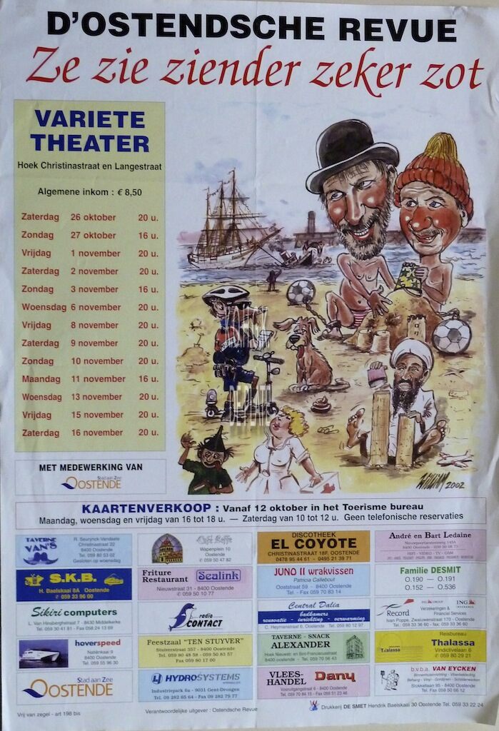 Omschrijving Formaat : 70 x 48 cm. 2002 Trefwoorden OOSTENDSE REVUE (NAAM) AFFICHES ZE ZIEN ZIENDER ZEEKER ZOT (REVUE) VARIETE THEATER (CHRISTINASTRAAT) Plaatskenmerk ZOLDER 301 LKA/16/797/34/0009 Inventarisnummers 2003/0002 Herkomst DESNERCK DANIEL Collectie Variéte Oostendse Revue Print