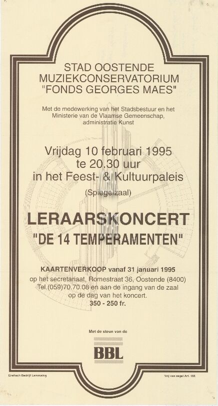 Omschrijving Formaat : 43 x 23cm Trefwoorden AFFICHES CONSERVATORIUM (MUZIEK) FONDS GEORGES MAES MUZIEK ; CONCERTEN FEEST- EN CULTUURPALEIS ; CONCERTEN Plaatskenmerk ZOLDER 301 LKA/12/780/48/1995-02 Inventarisnummers 2012/1202 10/ 02/ 1995 Vervaardiger Grafisch Bedrijf Lammaing Collectie Muziek Fonds Georges Maes Print