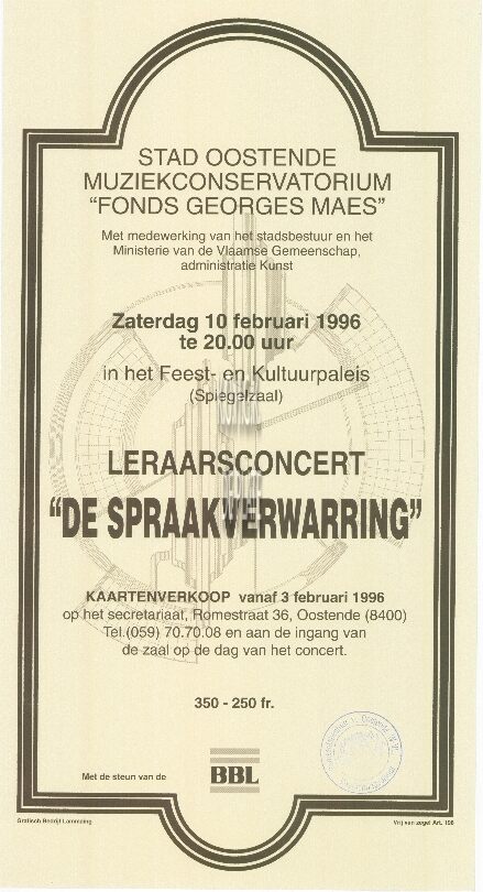 Omschrijving Formaat: 43 x 23cm Trefwoorden AFFICHES MUZIEK ; CONCERTEN FEEST- EN CULTUURPALEIS ; CONCERTEN FONDS GEORGES MAES CONSERVATORIUM (MUZIEK) Plaatskenmerk ZOLDER 301 LKA/12/780/48/1996-02 Inventarisnummers 2002/0455 10/ 02/ 1996 Vervaardiger Grafisch Bedrijf Lammaing Herkomst TIMMERMANS R. Collectie Muziek Fonds Georges Maes Print