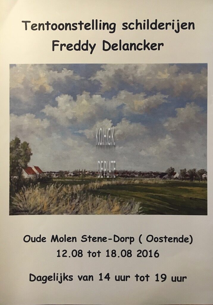 Affiche : Freddy Delancker. Tentoonstelling schilderijen. Oude molen Stene-Dorp. Van 12 tot 18 augustus 2016