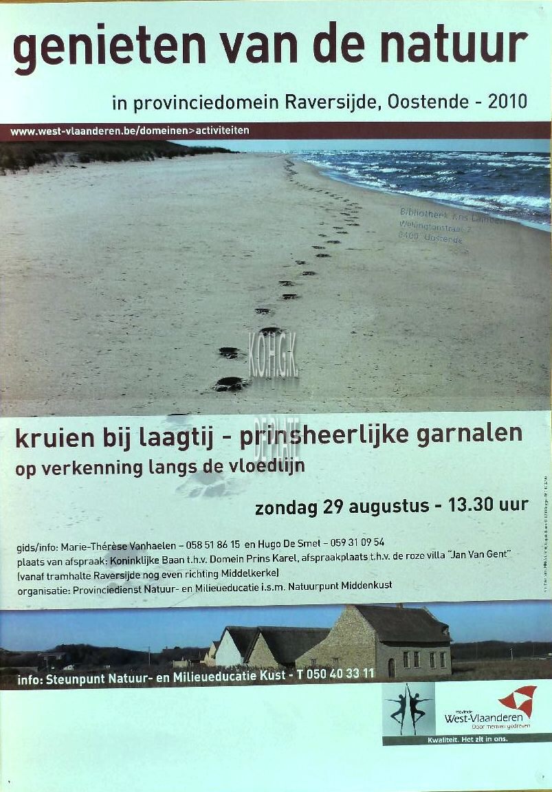 Affiche : Genieten van de natuur in provinciedomein Raversijde, Oostende 2010 : Kruien bij laagtij, prinsheerlijke garnalen : op verkenning langs de vloedlijn