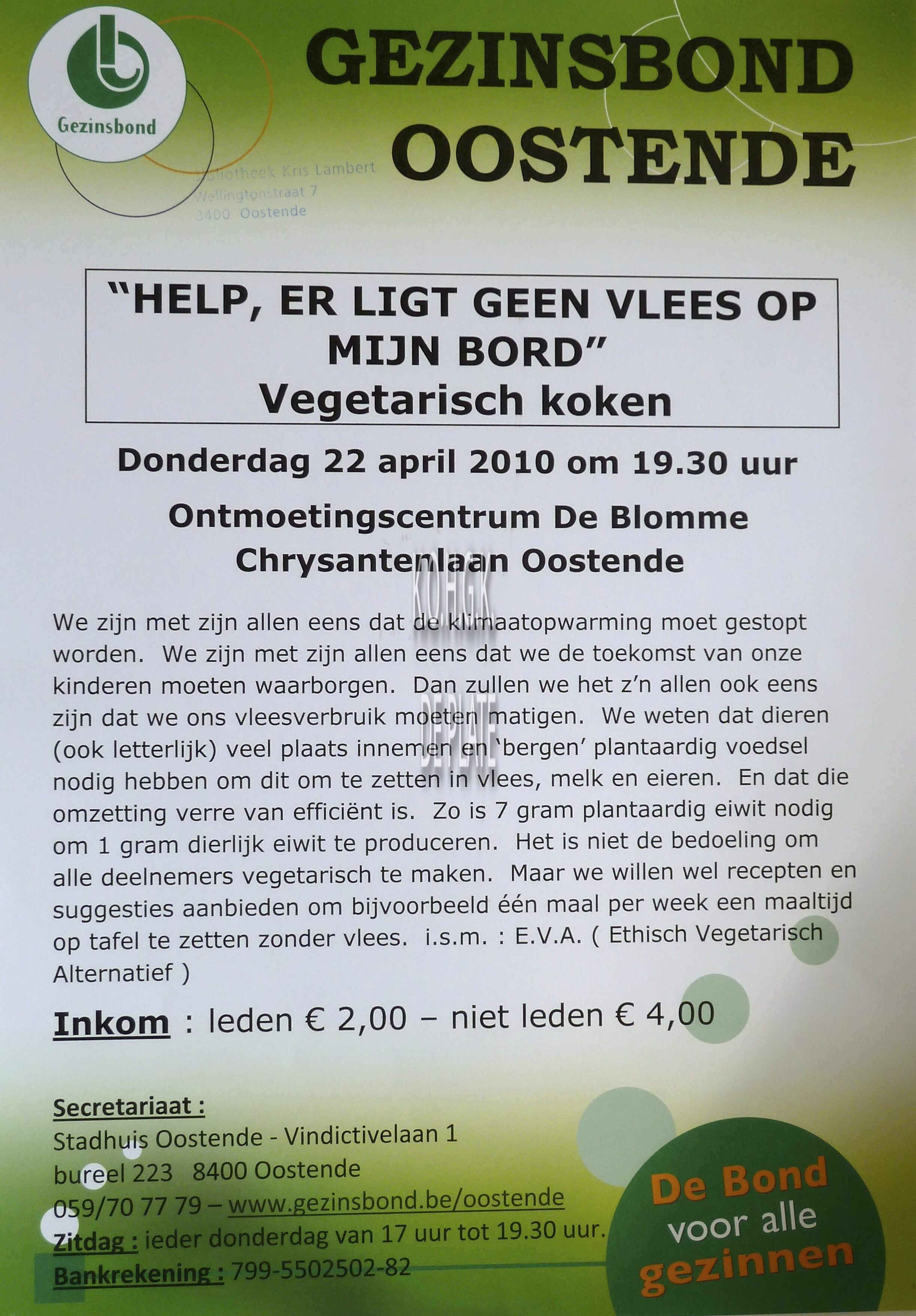 Affiche : Gezinsbond Oostende. "Help, er ligt geen vlees op mijn bord", vegetarisch koken. Ontmoetingscentrum De Blomme. 22 april 2010.