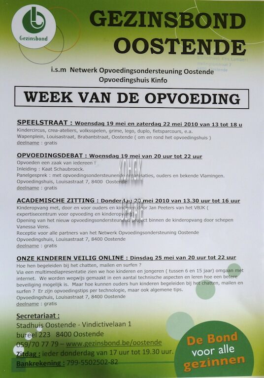 Affiche : Gezinsbond Oostende i.s.m. Netwerk Opvoedingsondersteuning Oostende, Opvoedingshuis Kinfo. Week van de opvoeding. Oostende. 19 tot 25 mei 2010