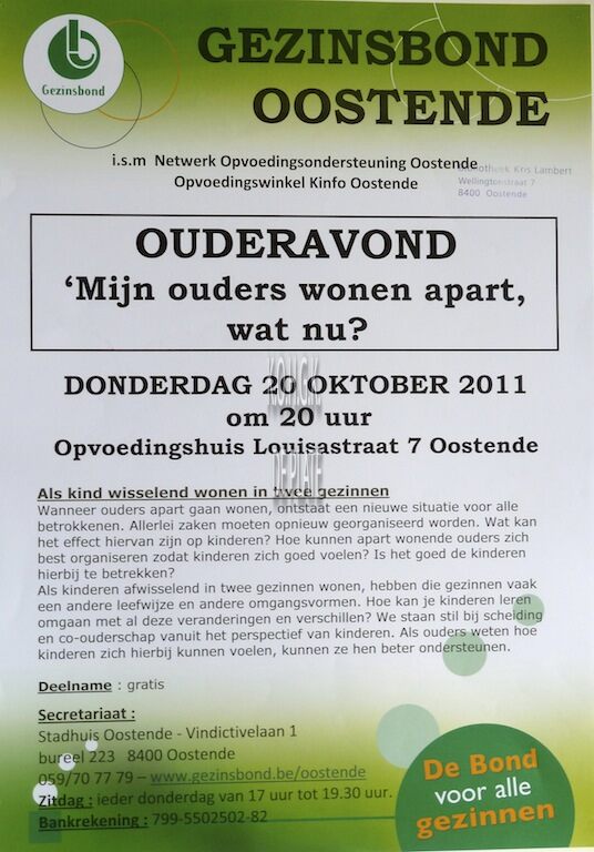 Affiche : Gezinsbond Oostende i.s.m. Netwerk Opvoedingsondersteuning Oostende, Opvoedingswinkel Kinfo. Ouderavond 'Mijn ouders wonen apart, wat nu?. Opvoedingshuis. Donderdag 20 oktober 2011.