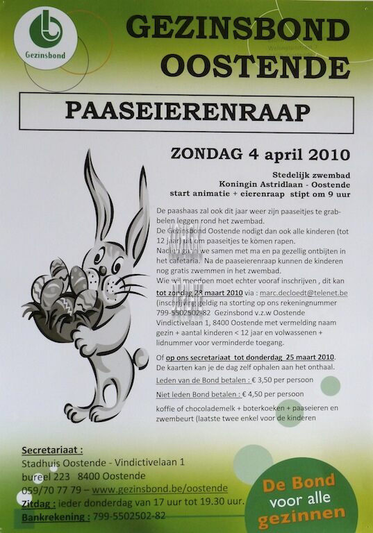 Affiche : Gezinsbond Oostende. Paaseierenraap. Stedelijk Zwembad. 4 april 2010.