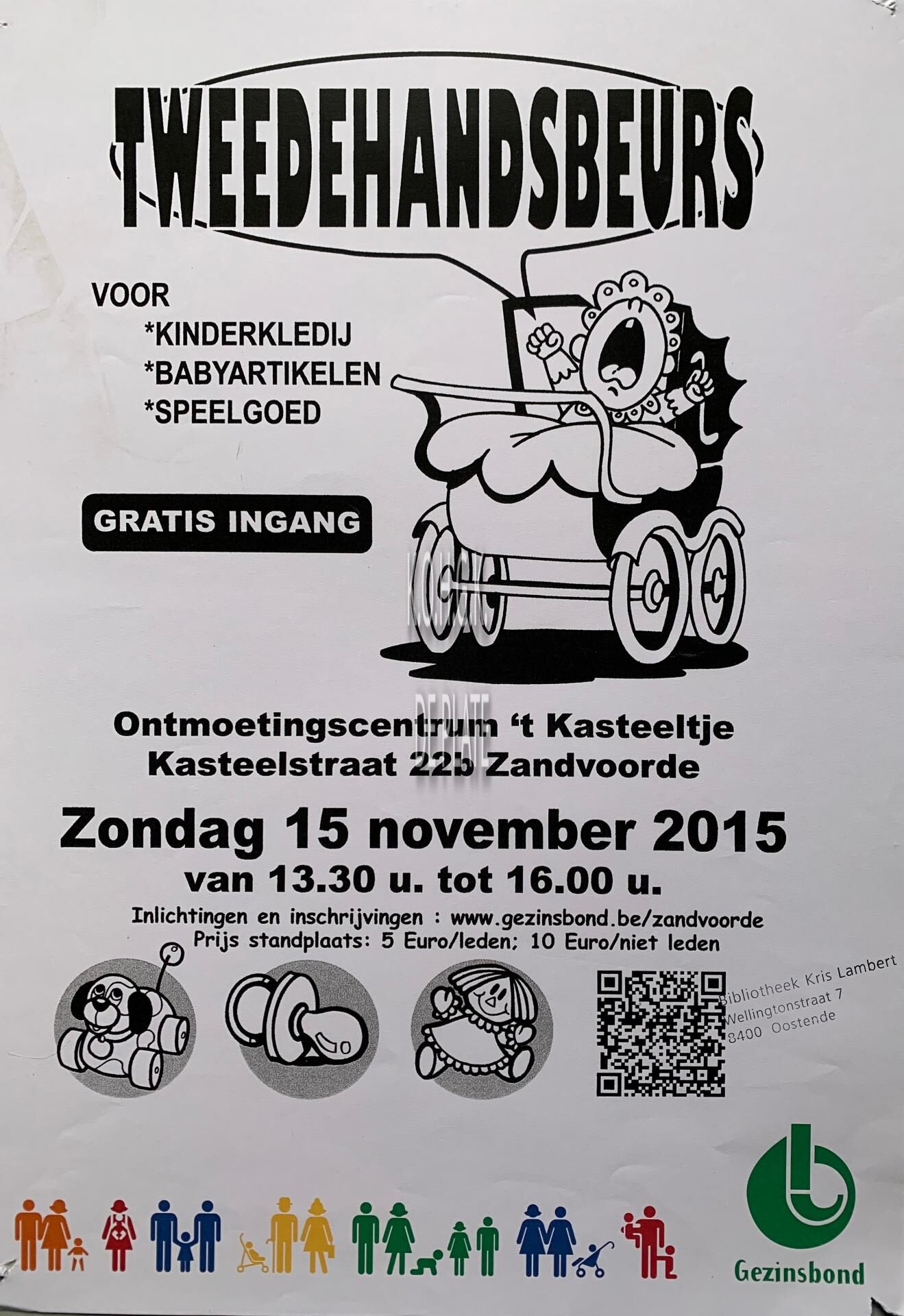 Affiche : Gezinsbond Zandvoorde. Tweedehandsbeurs voor kinderkledij, babyartikelen en speelgoed. Ontmoetingscentrum 't Kasteeltje. 15/11/2015