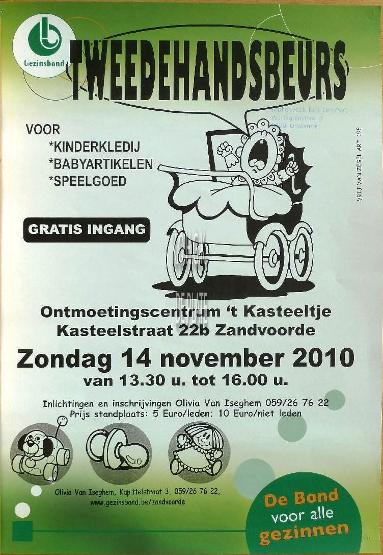 Affiche : Gezinsbond Zandvoorde. Tweedehandsbeurs voor kinderkledij, babyartikelen, speelgoed. OC 't Kasteeltje. 14/11/2010