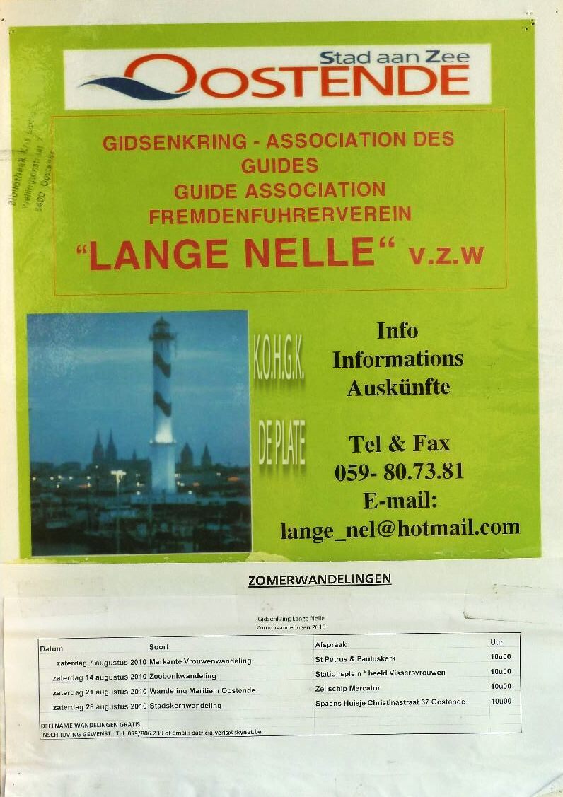 Affiche : Gidsenkring Lange Nelle. Zomerwandelingen 2010. Oostende. 7-14-21-28/08/2010