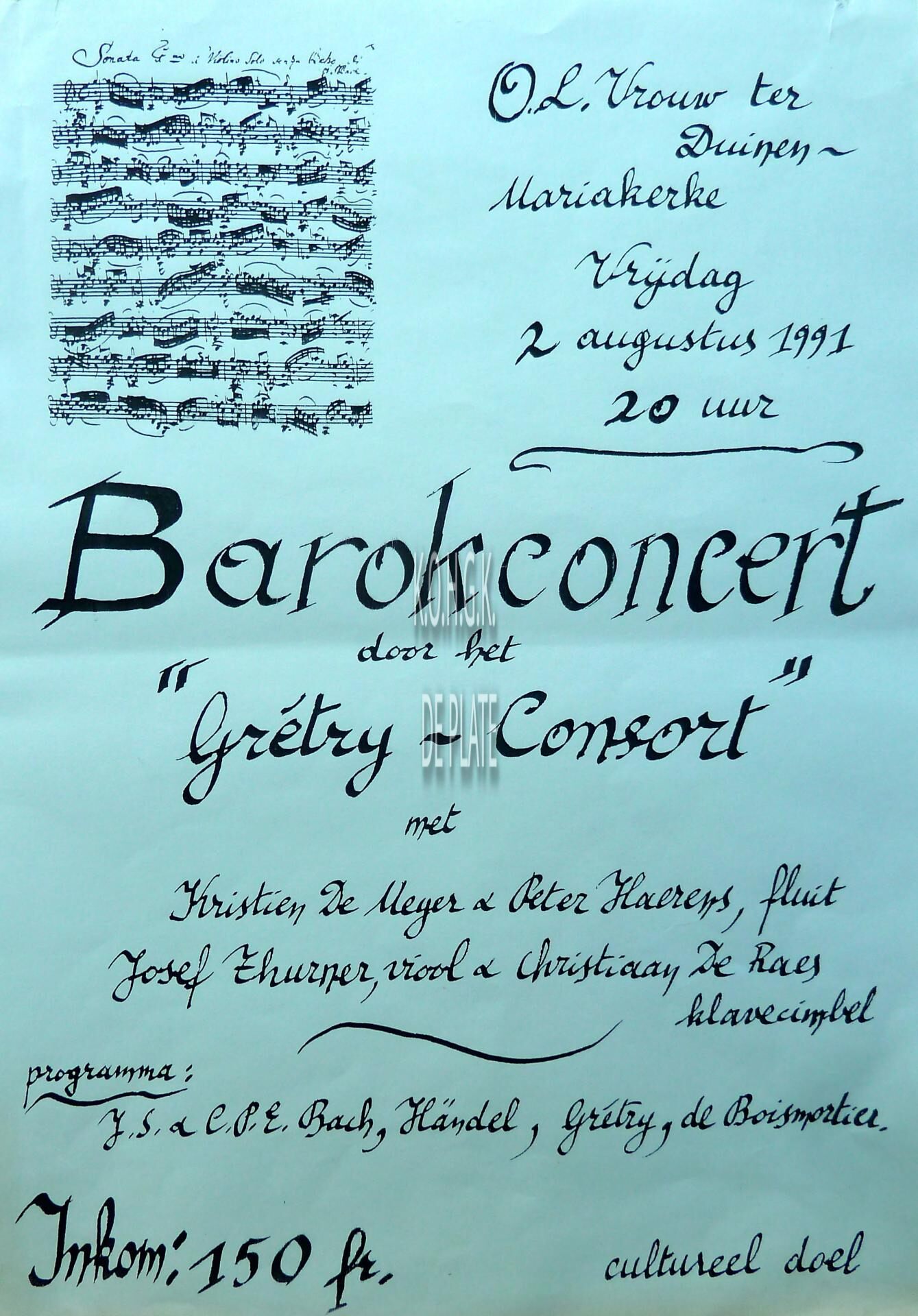 Omschrijving Formaat : 42 x 30 cm. - Met : Kristien De Meyer en Peter Haerens, fluit ; Josef Thurner, viool en Christiaan De Raes, klavecimbel Trefwoorden AFFICHES ONZE-LIEVE-VROUW-TER DUINEN (DUINENKERK) MUZIEK ; CONCERTEN GRÉTRY-CONSORT (MUZIEKGROEP) THURNER JOSEF (VIOLIST) DE RAES CHRISTIAAN (MUZIKANT) DE MEYER KRISTIEN (FLUITISTE) HAERENS PETER (FLUITIST) Plaatskenmerk ZOLDER 301 LKA/12/780/46/1991-08 Inventarisnummers 2022/1606 02/ 08/ 1991 Herkomst DE RAES CHRISTIAAN Collectie Muziek Duinenkerk Print