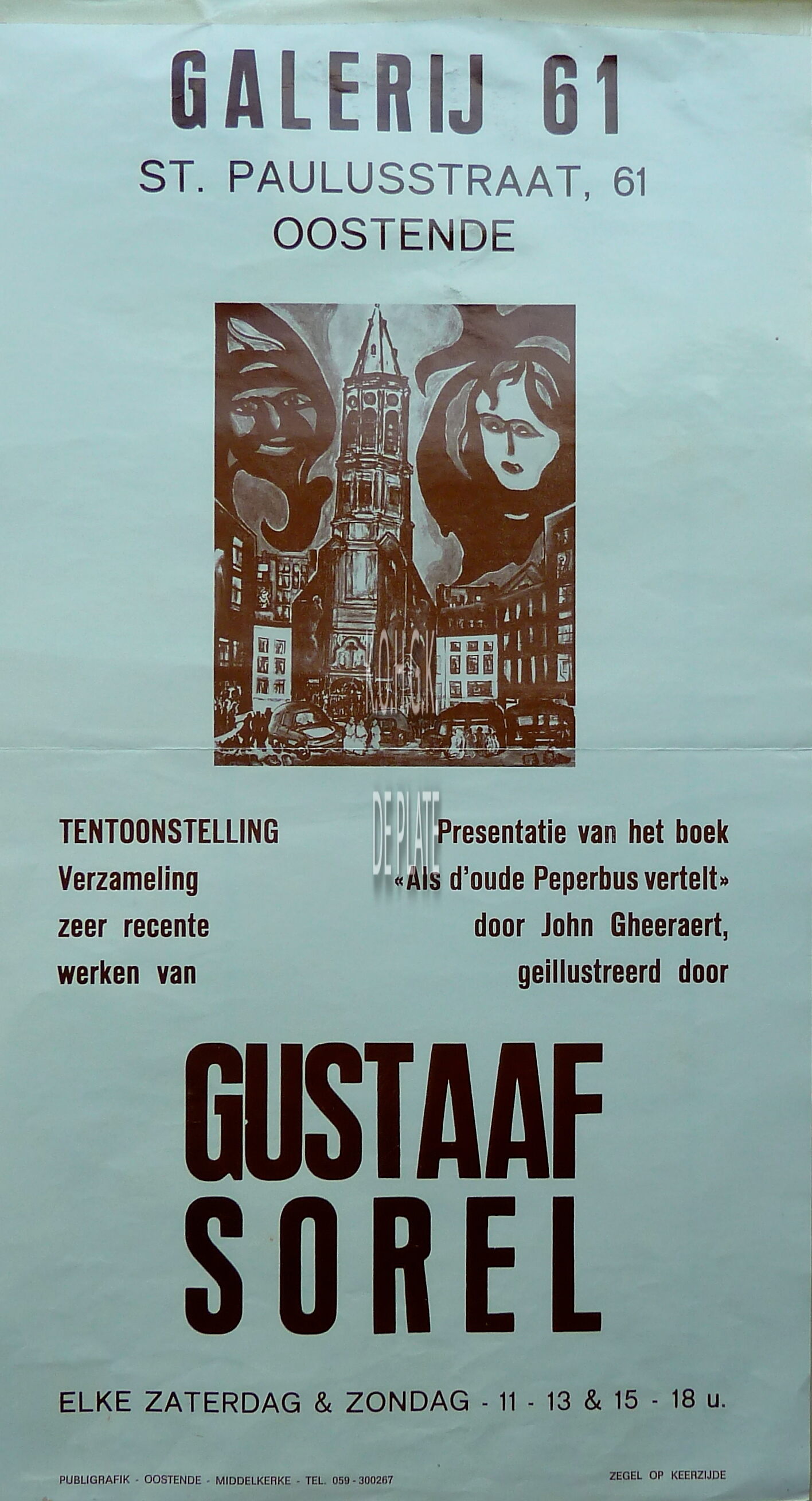 Formaat : 49 x 27 cm. - Galerij 61. Sint-Paulusstraat 61, Oostende. Verzameling zeer recente werken van ... . Presentatie van het boek "Als d'oude Peperbus vertelt" door John Gheeraert, geïllustreerd door Gustaaf Sorel
