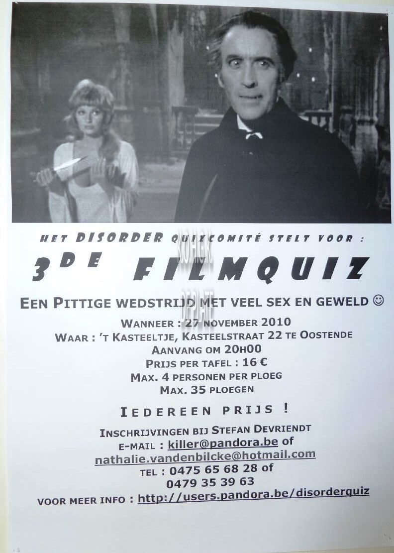 Formaat : 42 x 30 cm. - Het Disorder Quizcomité stelt voor : 3de filmquiz. Een pittige wedstrijd met veel sex en geweld. Wanneer : 27 november 2010. Waar : 't Kasteeltje, Kasteelstraat 22 te Oostende. Aanvang om 20h00. Prijs per tafel : 16 EUR. Max. 4 personen per ploeg. Max. 35 ploegen. Iedereen prijs!. Inschrijvingen bij Stefan Devriendt.