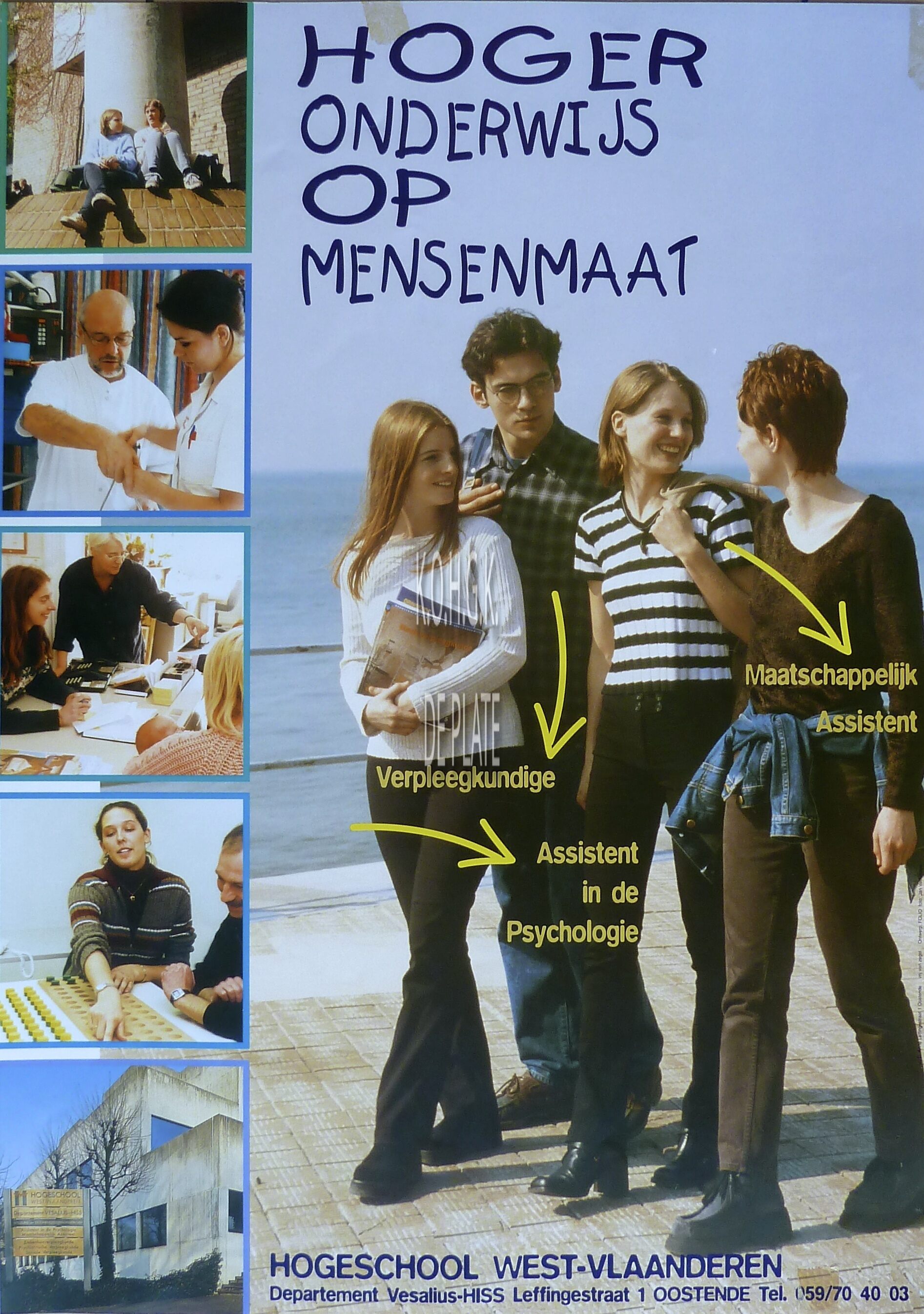 Affiche : Hogeschool West-Vlaanderen. Departement Vesalius-HISS. Hoger Onderwijs op Mensenmaat. Leffingestraat 1, Oostende