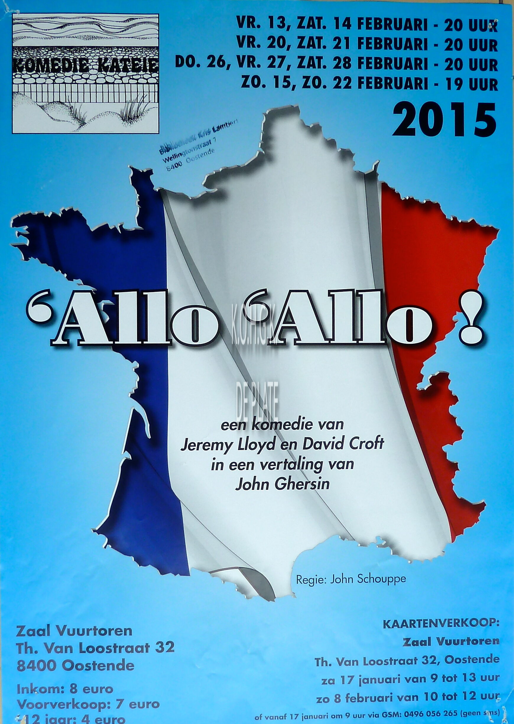 Omschrijving Formaat : 50 x 35 cm. - Een komedie van Jeremy Lloyd en David Croft, in een vertaling van John Ghersin. Regie : John Schouppe Trefwoorden AFFICHES KOMEDIE KATEIE (TONEELVERENIGING) ALLO ALLO (TONEELSTUK) TONEELSTUKKEN ZAAL VUURTOREN (THOMAS VAN LOOSTRAAT) LLOYD JEREMY (AUTEUR) CROFT DAVID (AUTEUR) SCHOUPPE JOHN (TONEELREGISSEUR) Plaatskenmerk ZOLDER 301 LKA/14/792/43/2015-02 Inventarisnummers 2017/2765 02/ 2015 Herkomst BIBLIOTHEEK KRIS LAMBERT Collectie Toneel Komedie Kateie Print