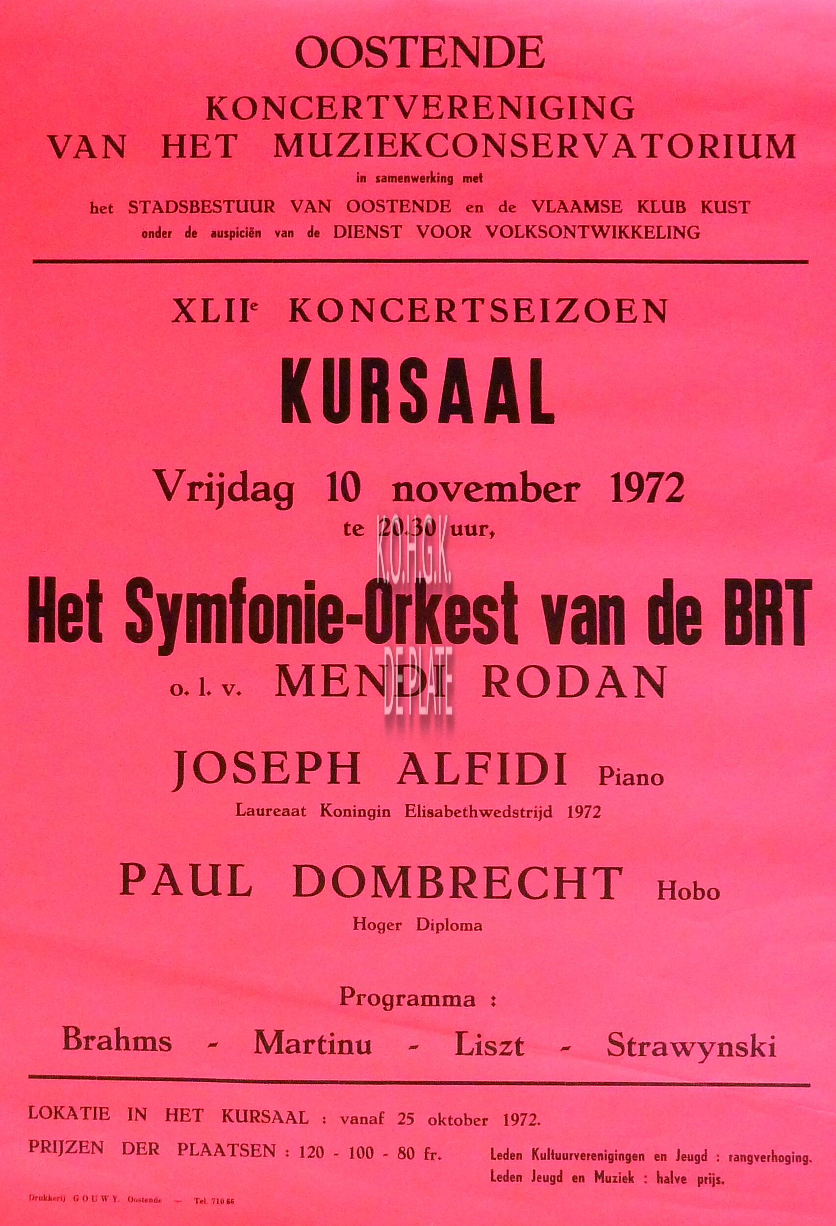Formaat : 65 x 45 cm. - o.l.v. Mendi Rodan. Joseph Alfidi, piano (laureaat Koningin Elisabethwedstrijd 1972) ; Paul Dombrecht, hobo. Programma : Brahms, Martinu, Liszt, Strawynski. In samenwerking met het Stadsbestuur van Oostende en de Vlaamse Klub Kust onder de auspiciën van de Dienst voor Volksontwikkeling.
