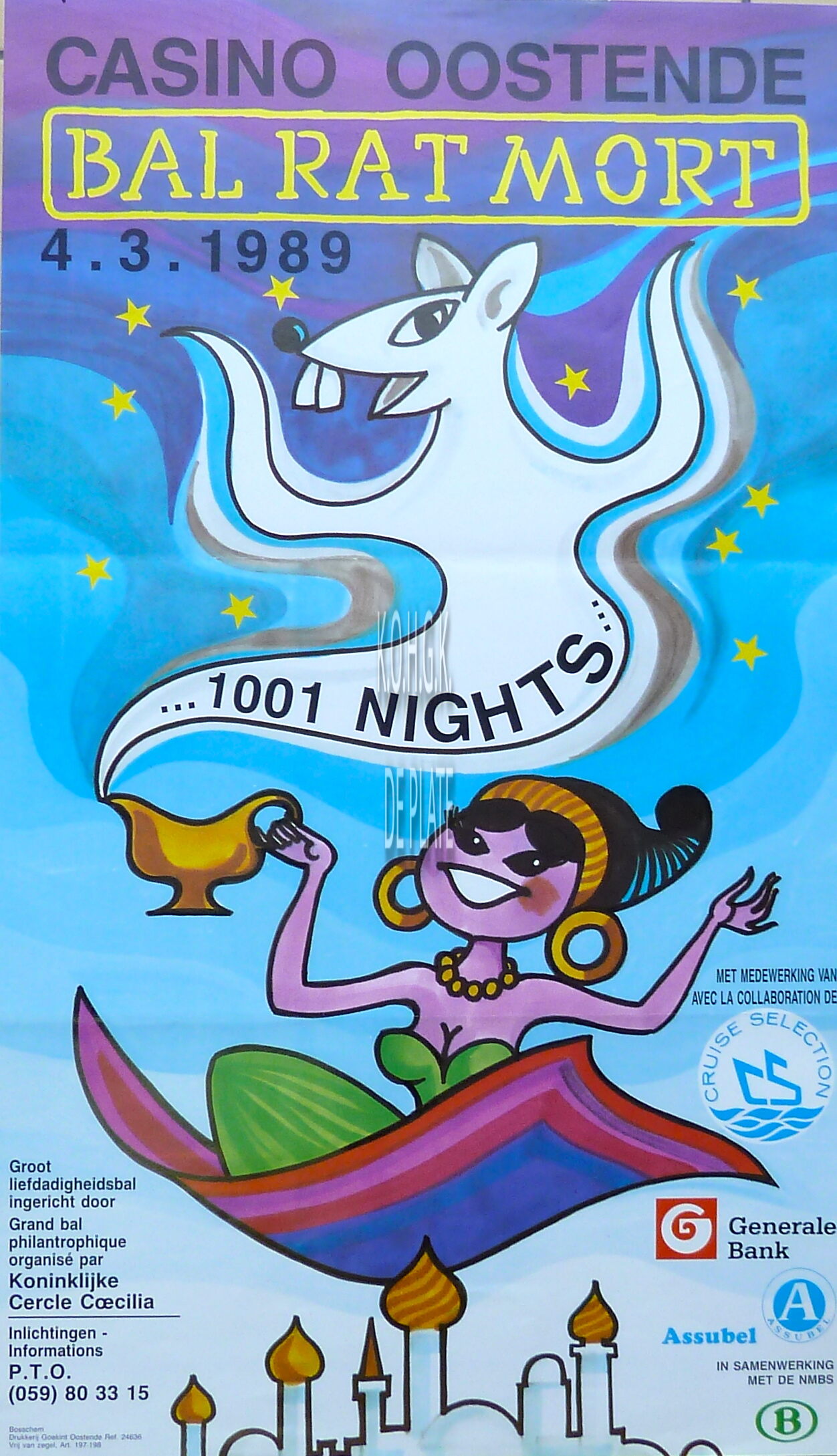 Omschrijving Formaat : 50 x 29 cm. - Ontwerp : Willy Bosschem Trefwoorden AFFICHES CARNAVAL FOLKLORE KONINKLIJKE CERCLE COECILIA (SOCIO-CULTURELE VERENIGING) BAL DU RAT MORT CASINO-KURSAAL ; BALS BOSSCHEM WILLY (KUNSTSCHILDER CARTOONIST PERSVERANTWOORDELIJKE KURSAAL) DUIZEND EN EEN NACHT (1989) (BAL DU RAT MORT) Plaatskenmerk ZOLDER 301 LKA/01/910/31/1989-03 Inventarisnummers 2013/2207 04/ 03/ 1989 Vervaardiger Drukkerij Goekint Collectie Carnaval Bal du Rat Mort Print