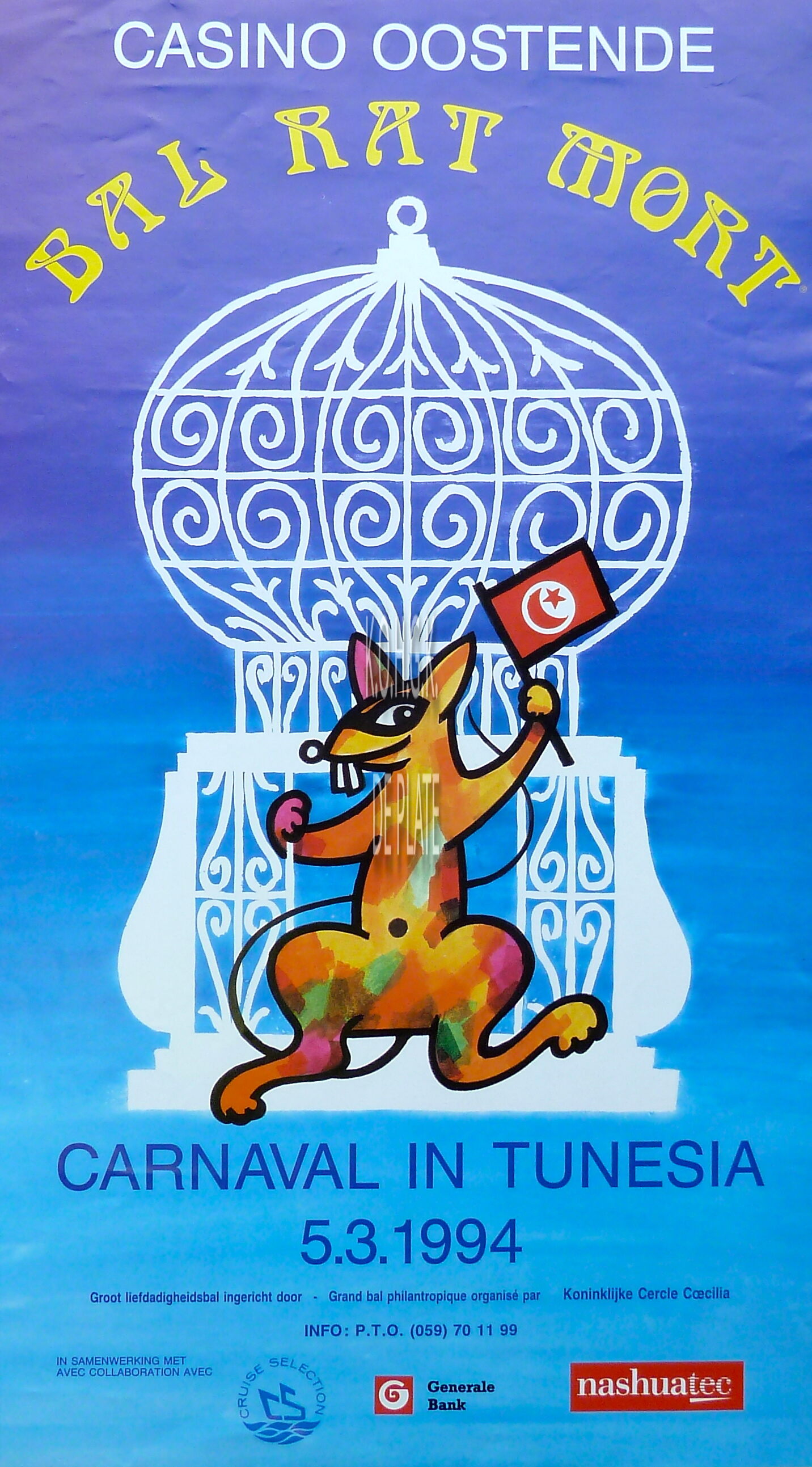 Omschrijving Formaat : 60 x 34 cm. - Ontwerp : Willy Bosschem Trefwoorden AFFICHES CARNAVAL FOLKLORE KONINKLIJKE CERCLE COECILIA (SOCIO-CULTURELE VERENIGING) BAL DU RAT MORT CASINO-KURSAAL ; BALS BOSSCHEM WILLY (KUNSTSCHILDER CARTOONIST PERSVERANTWOORDELIJKE KURSAAL) CARNAVAL IN TUNESIË (BAL DU RAT MORT) Plaatskenmerk ZOLDER 301 LKA/01/910/31/1994 Inventarisnummers 2013/2212 05/ 03/ 1994 Vervaardiger Goekint Graphics Herkomst DEGRAEVE ERIC Collectie Carnaval Bal du Rat Mort Print