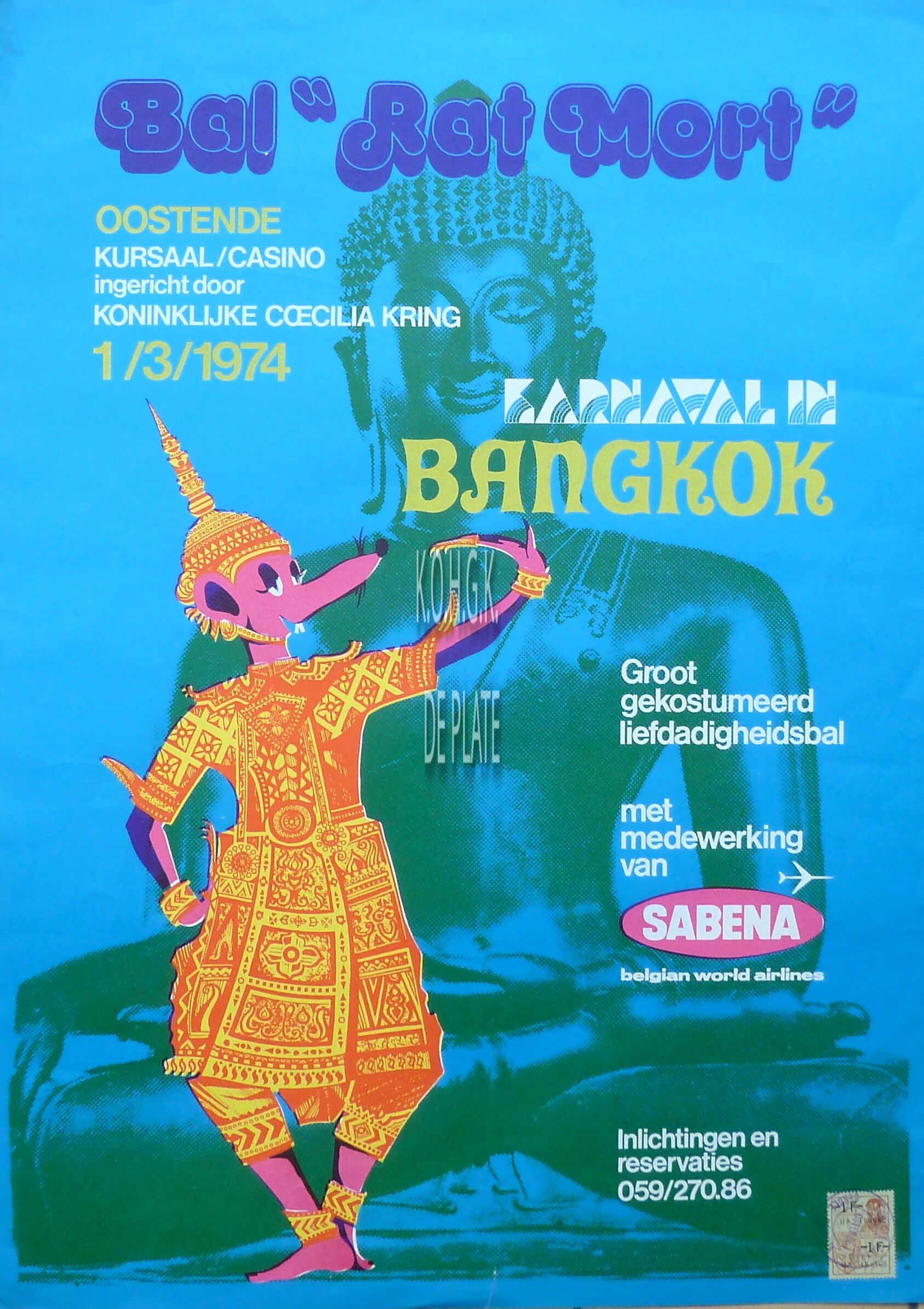 Omschrijving Formaat : 58 x 42 cm. - met medewerking van SABENA Trefwoorden AFFICHES CARNAVAL FOLKLORE KONINKLIJKE CERCLE COECILIA (SOCIO-CULTURELE VERENIGING) CASINO-KURSAAL ; BALS BAL DU RAT MORT CARNAVAL IN BANGKOK (BAL DU RAT MORT) Plaatskenmerk ZOLDER 301 LKA/01/910/31/1974-03 Inventarisnummers 2013/2203 01/ 03/ 1974 Herkomst Dreesen J.B. Collectie Carnaval Bal du Rat Mort Print