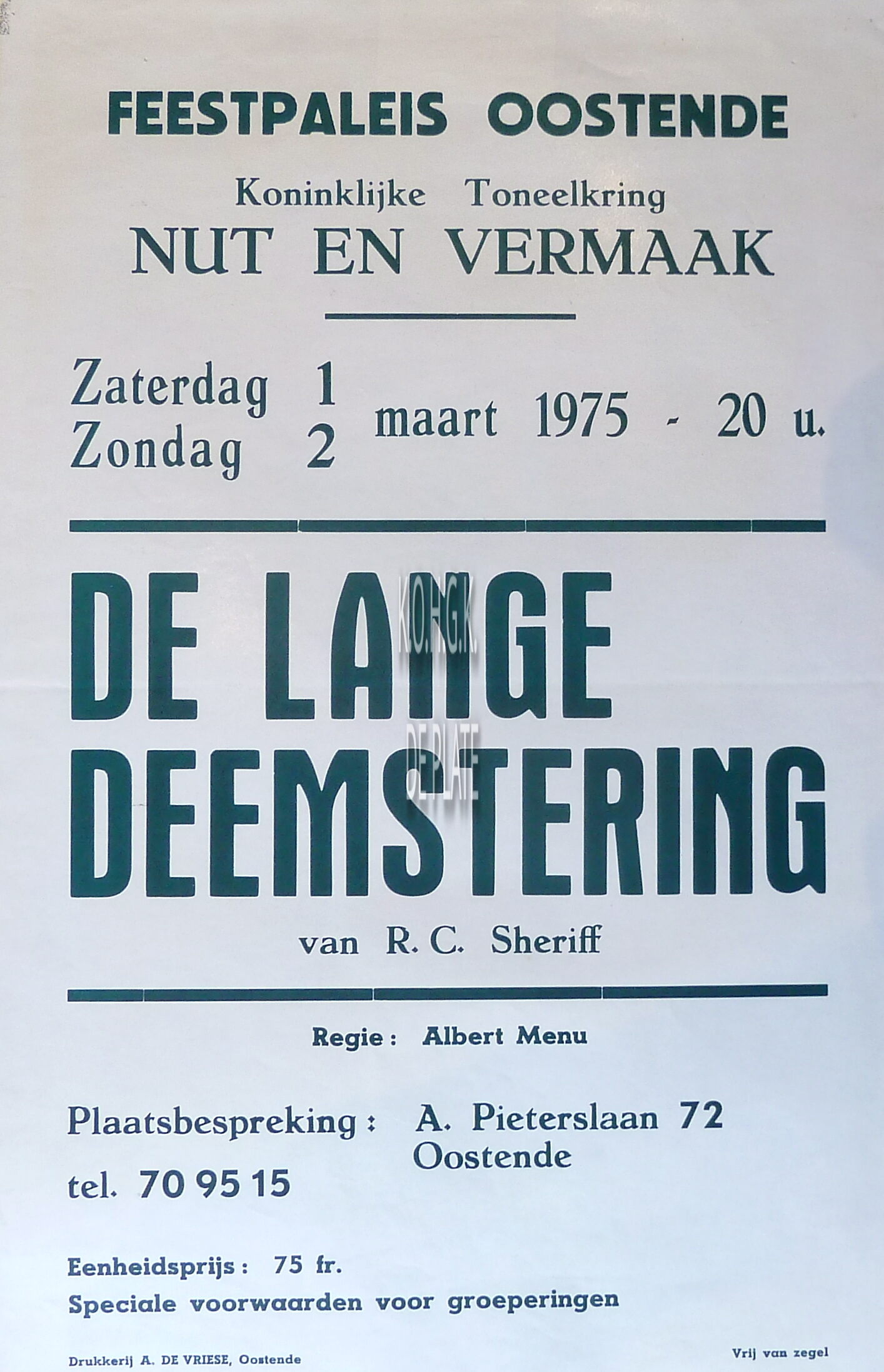 Omschrijving Formaat : 50 x 32 cm. - Een toneelstuk van R.C. Sherrif. Regie: Albert Menu. Trefwoorden NUT EN VERMAAK (TONEELVERENIGING) TONEELSTUKKEN AFFICHES FEEST- EN CULTUURPALEIS ; TONEEL DE LANGE DEEMSTERING (TONEELSTUK) SHERRIF R.C. (1896-1975) (AUTUER) MENU ALBERT (TONEELREGISSEUR) Plaatskenmerk ZOLDER 301 LKA/15/792/50/1975 Inventarisnummers 2013/1671 03/ 1975 Vervaardiger De Vriese A. Collectie Toneel Nut en Vermaak Print