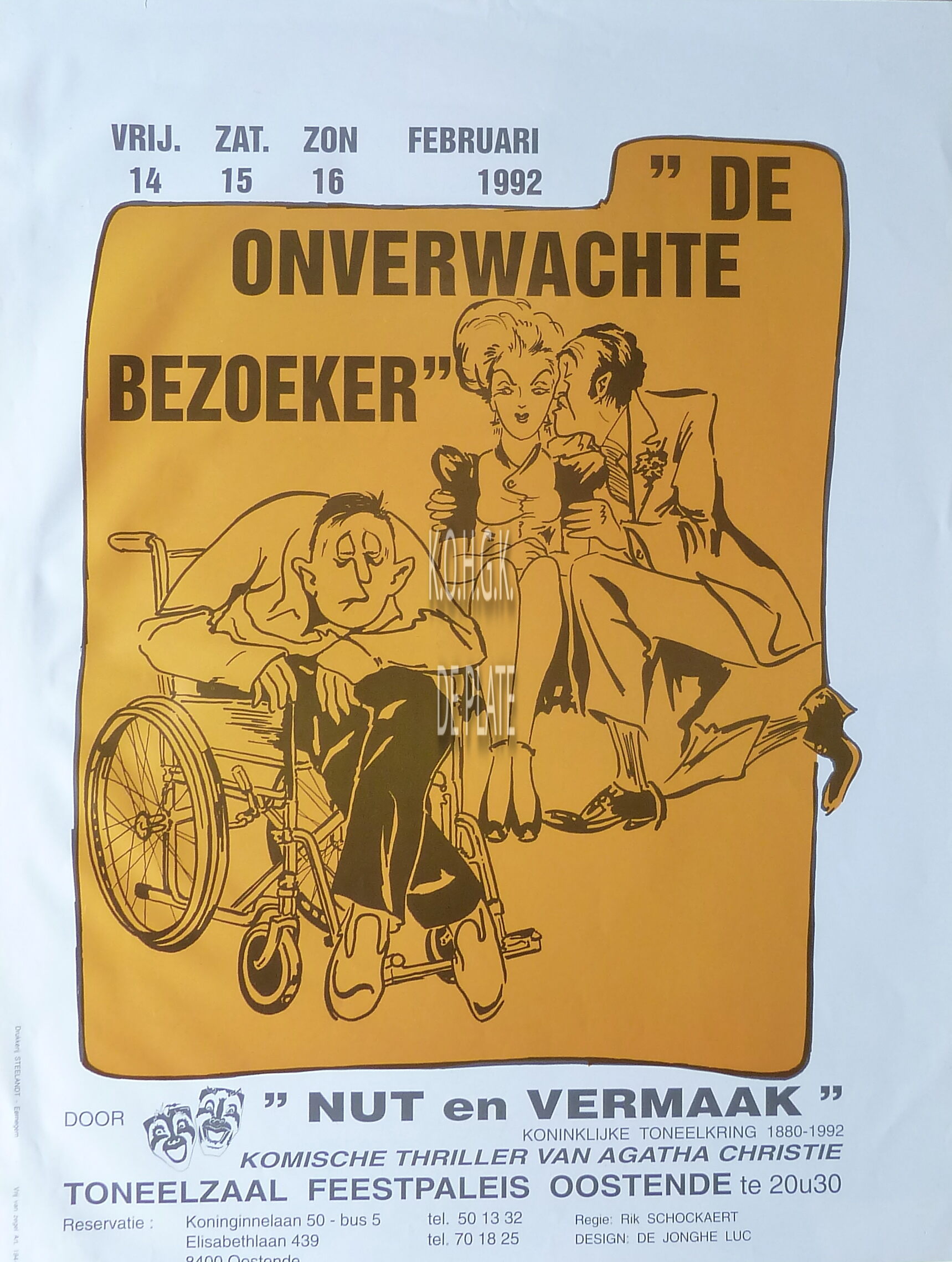 Omschrijving Formaat : 55 x 42. - Komische thriller van Agatha Christie. Trefwoorden AFFICHES TONEELSTUKKEN NUT EN VERMAAK (TONEELVERENIGING) FEEST- EN CULTUURPALEIS ; TONEEL DE ONVERWACHTE BEZOEKER (TONEELSTUK) CHRISTIE AGATHA (1890-1976) (AUTEUR) SCHOCKAERT RIK (TONEELREGISSEUR) Plaatskenmerk ZOLDER 301 LKA/15/792/50/1992 Inventarisnummers 2012/2481 02/ 1992 Vervaardiger Drukkerij Steelandt Collectie Toneel Nut en Vermaak Print