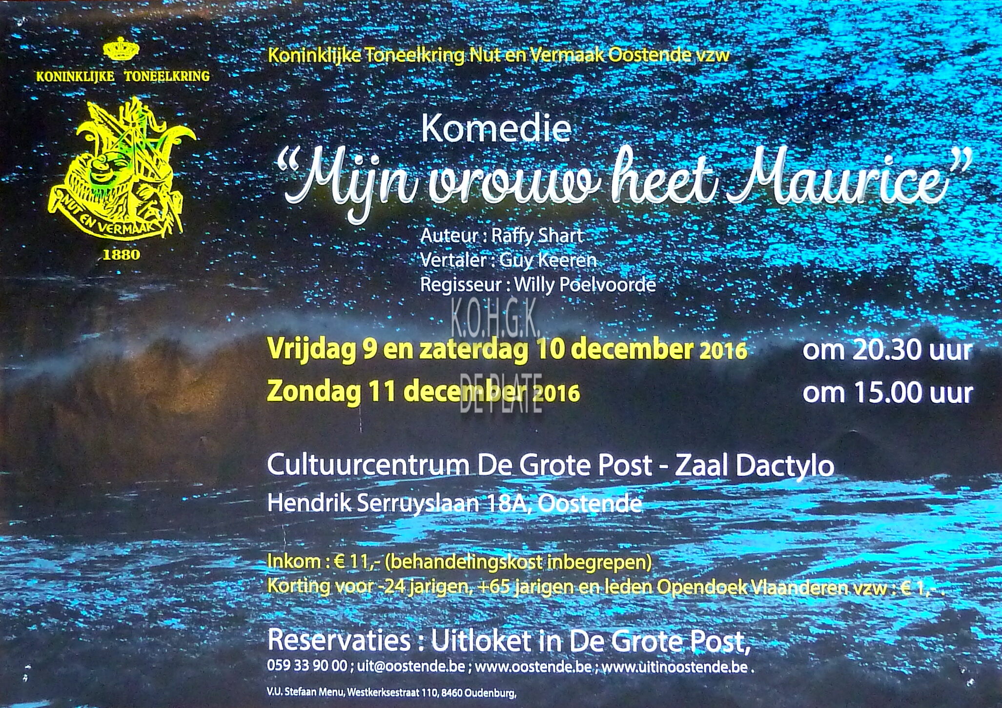 Omschrijving Formaat : 30 x 42 cm. - Komedie. Auteur : Raffy Shart. Vertaler : Guy Keeren. Regisseur : Willy Poelvoorde Trefwoorden AFFICHES MIJN VROUW HEET MAURICE (TONEELSTUK) NUT EN VERMAAK (TONEELVERENIGING) TONEELSTUKKEN SHART RAFFY (AUTEUR) POELVOORDE WILLY (TONEELREGISSEUR) CULTUURCENTRUM DE GROTE POST ; TONEEL Plaatskenmerk ZOLDER 301 LKA/15/792/50/2016-12 Inventarisnummers 2017/2750 12/ 2016 Uitgever Stefaan Menu Collectie Toneel Nut en Vermaak Print