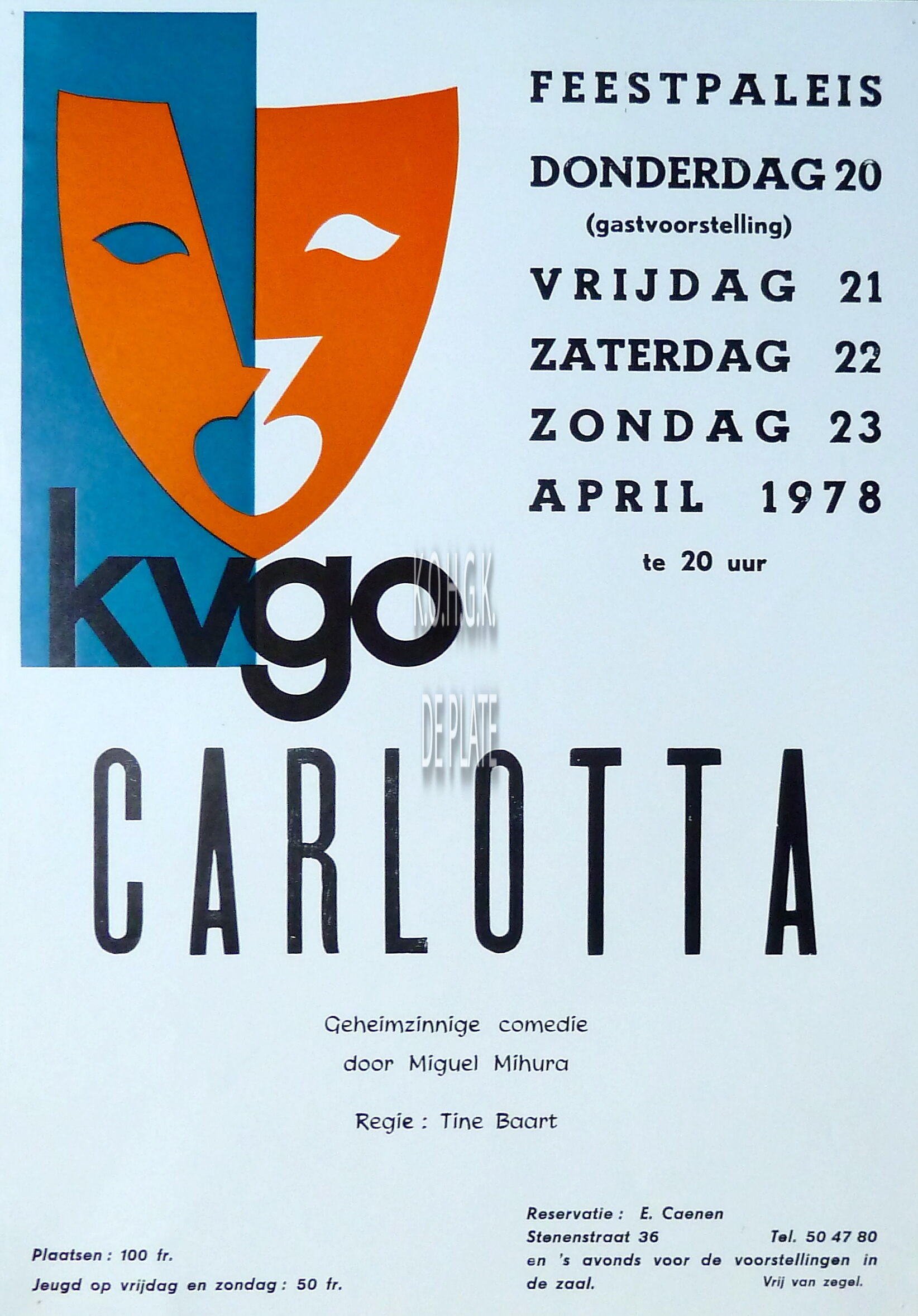 Omschrijving Formaat : 42 x 30 cm. Geheimzinnige comedie door Miguel Mihura. Regie : Tine Baart. Trefwoorden KVGO (TONEEL) TONEELSTUKKEN AFFICHES FEEST- EN CULTUURPALEIS ; TONEEL CARLOTTA (TONEELSTUK) MIHURA MIGUEL (AUTEUR) BAART TINE (TONEELREGISSEUSE) Plaatskenmerk ZOLDER 301 LKA/14/792/45/1978 Inventarisnummers 2013/1627 04/ 1978 Collectie Toneel KVGO Print