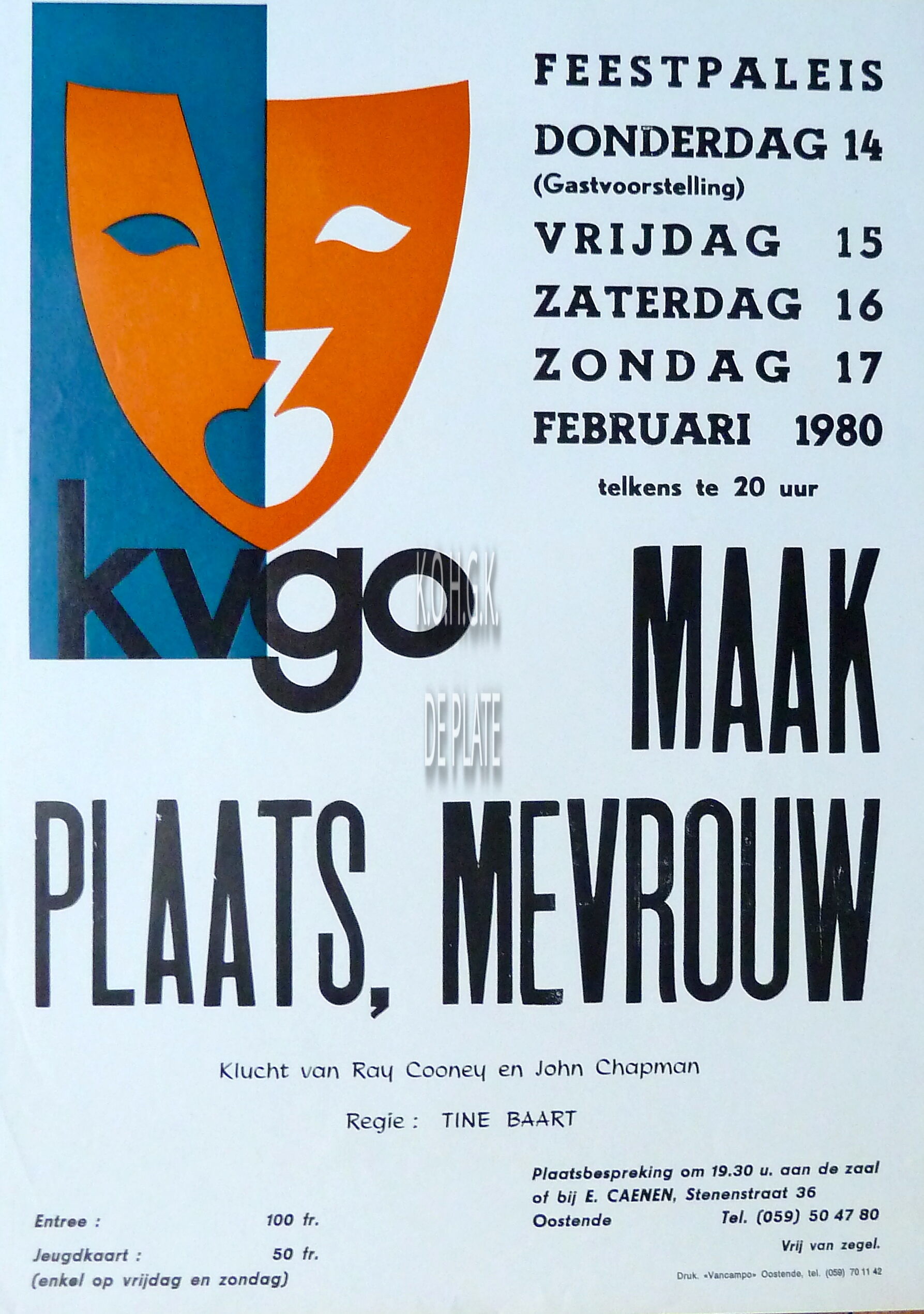 Omschrijving Formaat : 42 x 30 cm. Klucht van Ray Cooney en John Chapman. Regie : Tine Baart. Trefwoorden TONEELSTUKKEN KVGO (TONEEL) AFFICHES FEEST- EN CULTUURPALEIS ; TONEEL MAAK PLAATS MEVROUW (TONEELSTUK) COONEY RAY (AUTEUR) CHAPMAN JOHN (AUTEUR) BAART TINE (TONEELREGISSEUSE) Plaatskenmerk ZOLDER 301 LKA/14/792/45/1980 Inventarisnummers 2013/1630 02/ 1980 Vervaardiger Vancampo Collectie Toneel KVGO Print