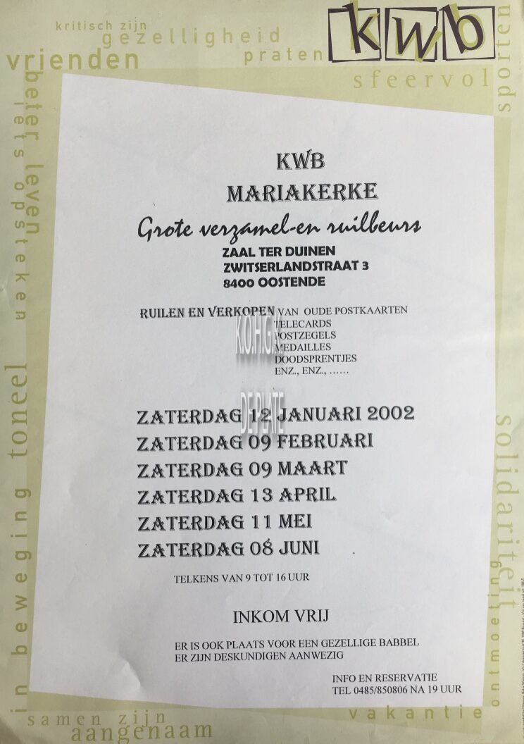 Omschrijving Formaat: 42 x 30 cm. Trefwoorden AFFICHES RUILBEURZEN KWB (KRISTELIJKE WERKNEMERSBEWEGING) ZAAL TER DUINEN Plaatskenmerk ZOLDER 301 LKA/05/372.6/01/31/2002 Inventarisnummers 2017/2956 12/ 01/ 2002 Collectie Markten Beurzen Ruilbeurzen Print