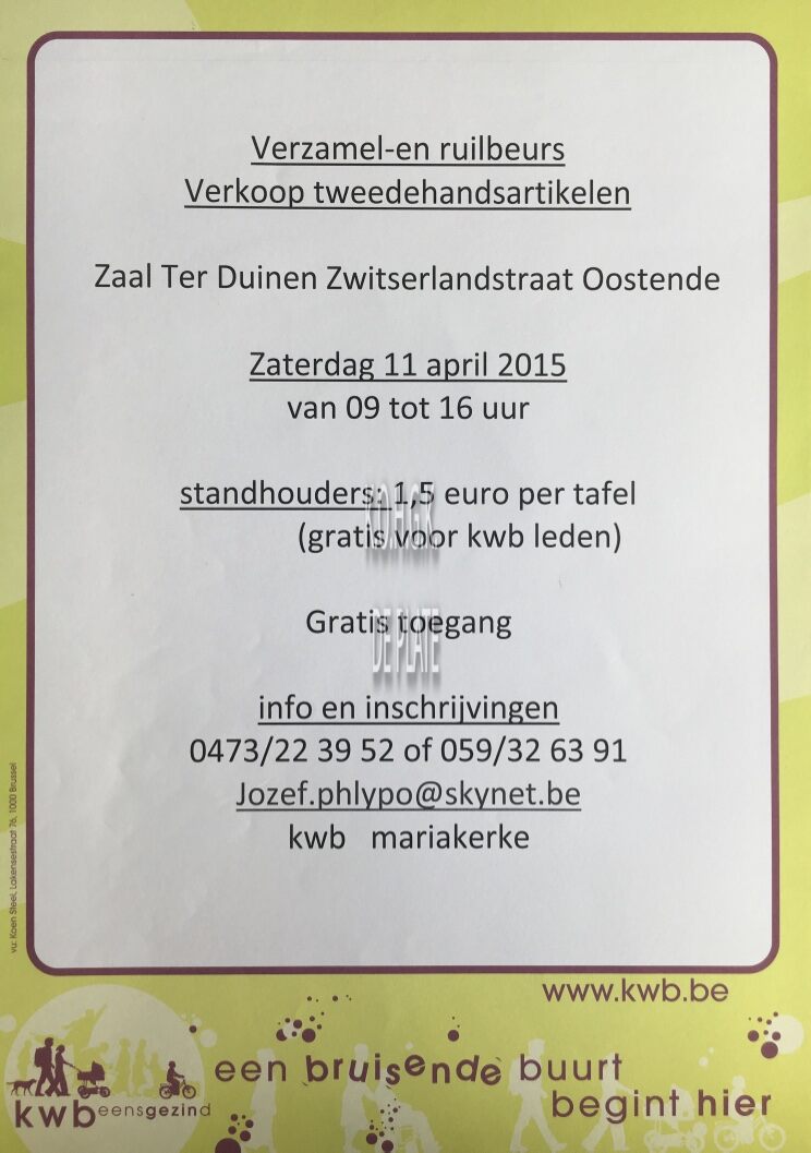 Omschrijving Formaat: 42 x 30 cm. Trefwoorden AFFICHES KWB (KRISTELIJKE WERKNEMERSBEWEGING) RUILBEURZEN ZAAL TER DUINEN Plaatskenmerk ZOLDER 301 LKA/05/372.6/31/2015-04 Inventarisnummers 2017/2961 11/ 04/ 2015 Collectie Markten Beurzen Ruilbeurzen Print