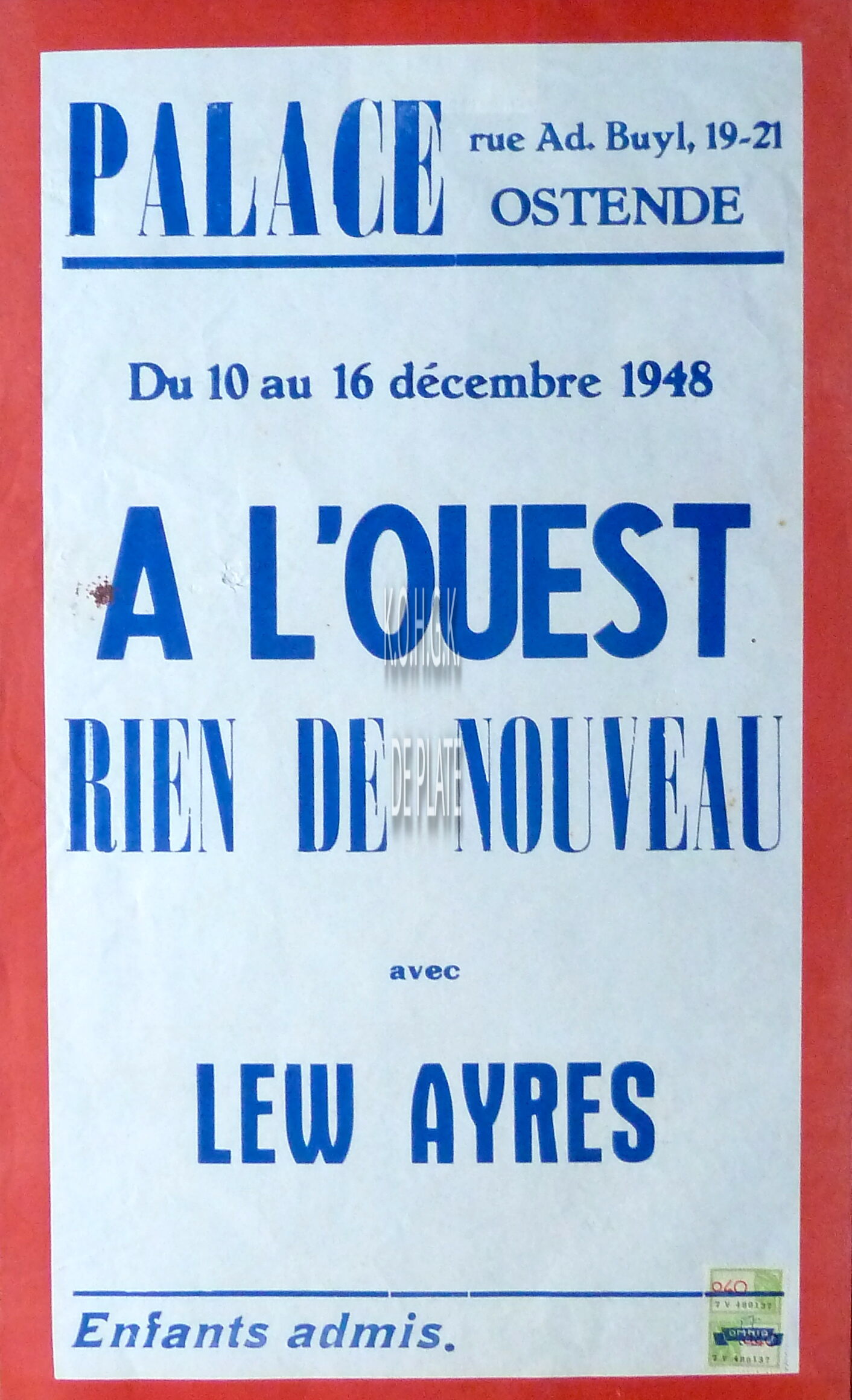 Omschrijving Formaat : 50 x 30 cm. Lew Ayres Trefwoorden CINE PALACE (CINEMA) AFFICHES FILMVOORSTELLINGEN A L'OUEST RIEN DE NOUVEAU (ALL QUIET ON THE WESTERN FRONT) (FILM) AYRES LEW (1908-1996) (ACTEUR) Plaatskenmerk ZOLDER 301 LKA/01/798/31/1948 Inventarisnummers 2013/1791 12/ 1948 Vervaardiger Drukkerij Omnia Collectie Film Cinema Palace Print