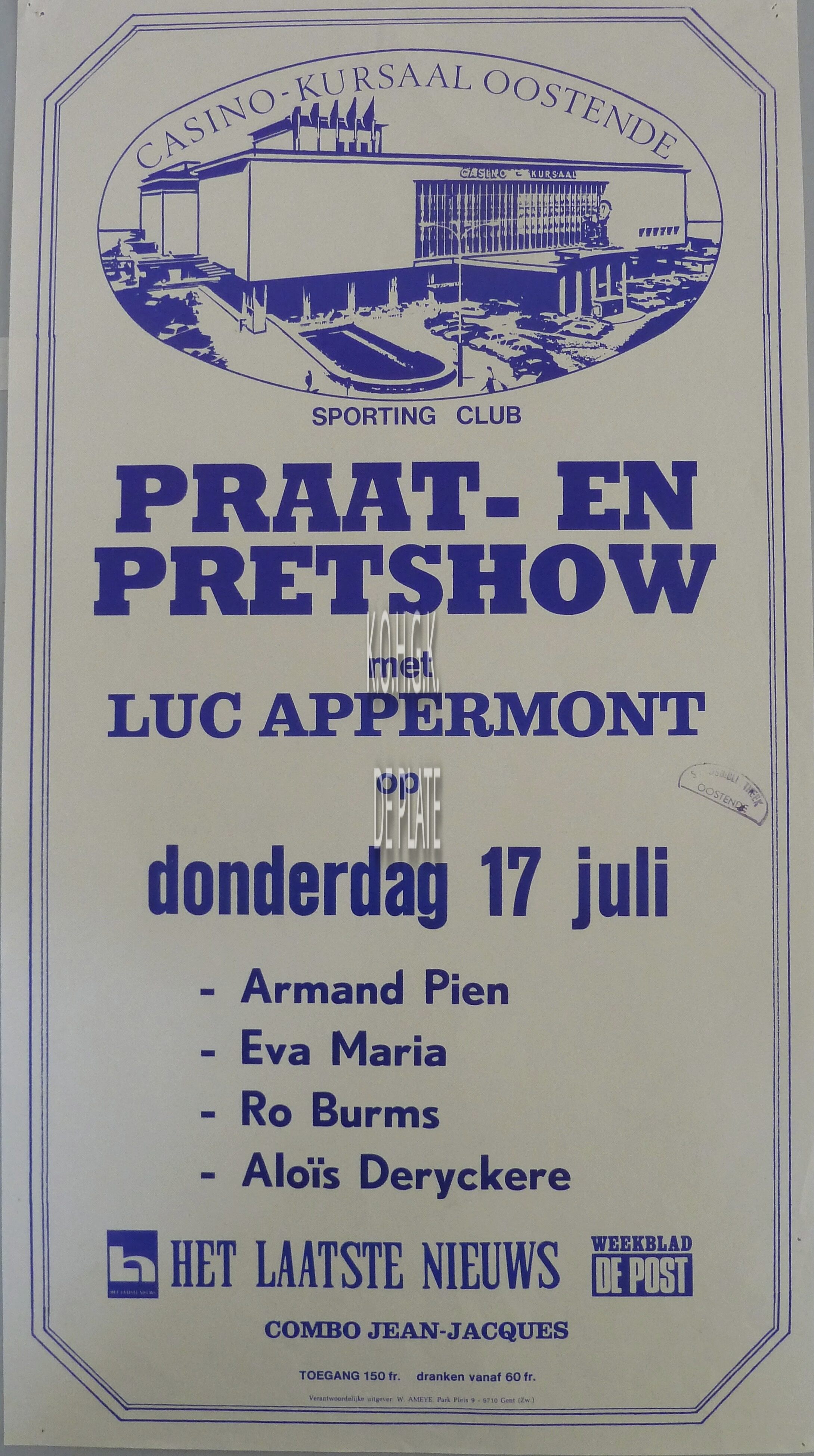 Omschrijving Formaat : 55 x 30 cm. Armand Pien, Eva Maria, Ro Burms, Aloïs Deryckere, Combo Jean-Jacques Trefwoorden AFFICHES CASINO-KURSAAL ; EVENEMENTEN APPERMONT LUC (PRESENTATOR) Plaatskenmerk ZOLDER 301 LKA/01/375.9/11/0013 Inventarisnummers 2014/6345 Uitgever W. Ameye Herkomst Stadsbibliotheek Collectie Evenementen Casino-Kursaal Print