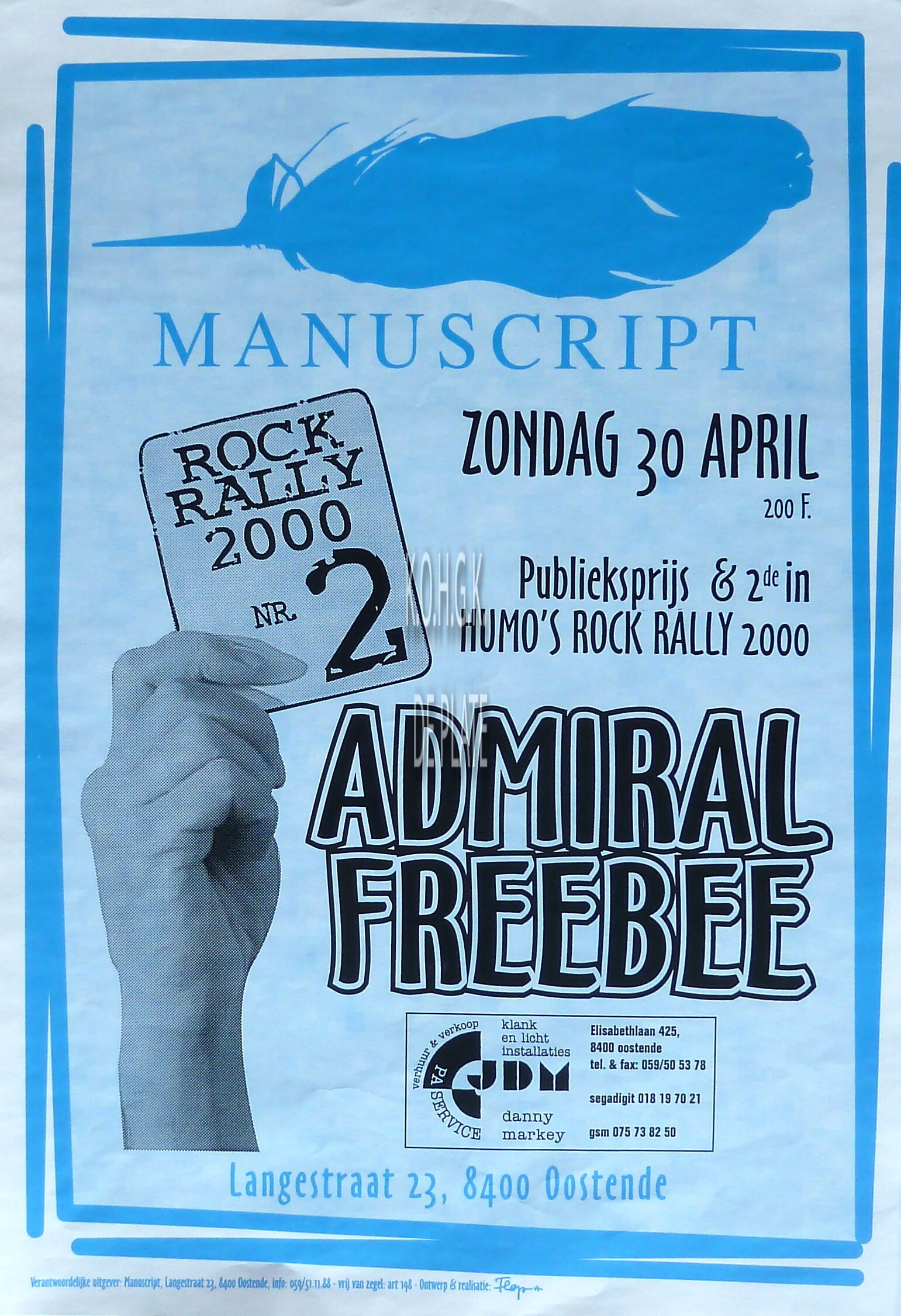 Omschrijving Formaat : 42 x 30 cm. Trefwoorden AFFICHES MANUSCRIPT (CAFE) MUZIEK ; CONCERTEN LANGESTRAAT ADMIRAL FREEBEE (TOM VAN LAERE) (MUZIKANT) Plaatskenmerk ZOLDER 301 LKA/13/780/63/2000-04 Inventarisnummers 2018/0693 30/ 04/ 2000 Uitgever Manuscript Herkomst AANKOOP Collectie Muziek Manuscript Print