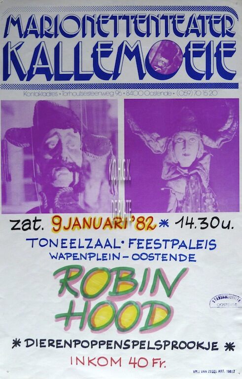 Omschrijving Formaat : 39 x 25 cm. Trefwoorden AFFICHES POPPENSPEL KALLEMOEIE (MARIONETTENTHEATER) ROBIN HOOD (POPPENSPEL) FEEST- EN CULTUURPALEIS ; EVENEMENTEN Plaatskenmerk ZOLDER 301 LKA/02/794/31/1982-01 Inventarisnummers 2004/0547 09/ 01/ 1982 Herkomst Stadsbibliotheek Collectie Marionetten- en Poppenspel Kallemoeie Print