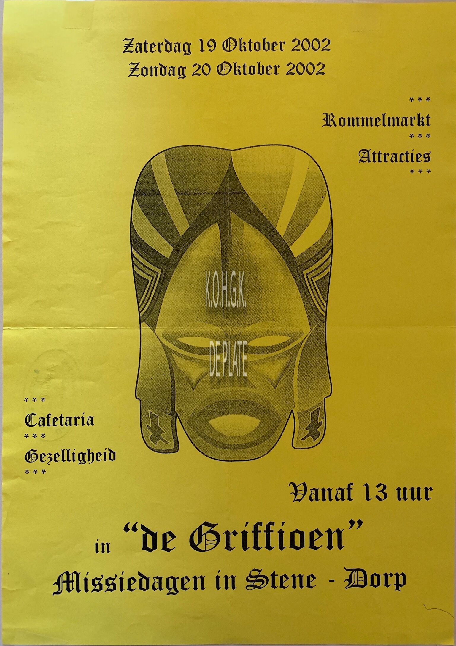 Affiche : Missiedagen in Stene-Dorp. Rommelmarkt, Attracties, Cafetaria, Gezelligheid. De Griffioen. 19-20/10/2002