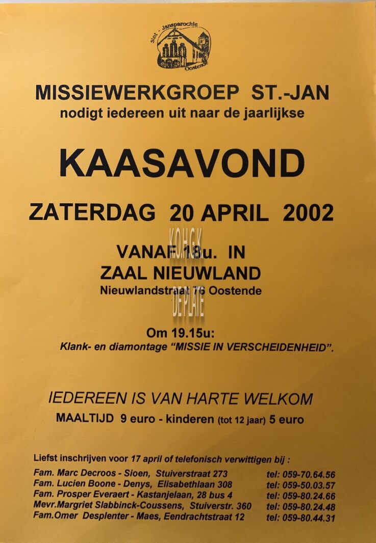 Omschrijving Formaat : 42 x 30 cm. Trefwoorden AFFICHES MISSIEWERKGROEP ST.-JAN OOSTENDE ZAAL NIEUWLAND Plaatskenmerk ZOLDER 301 LKA/02/244/01/2002-04 Inventarisnummers 2019/1200 20/ 04/ 2002 Herkomst AANKOOP Collectie Kerk en Maatschappij Algemeen Print