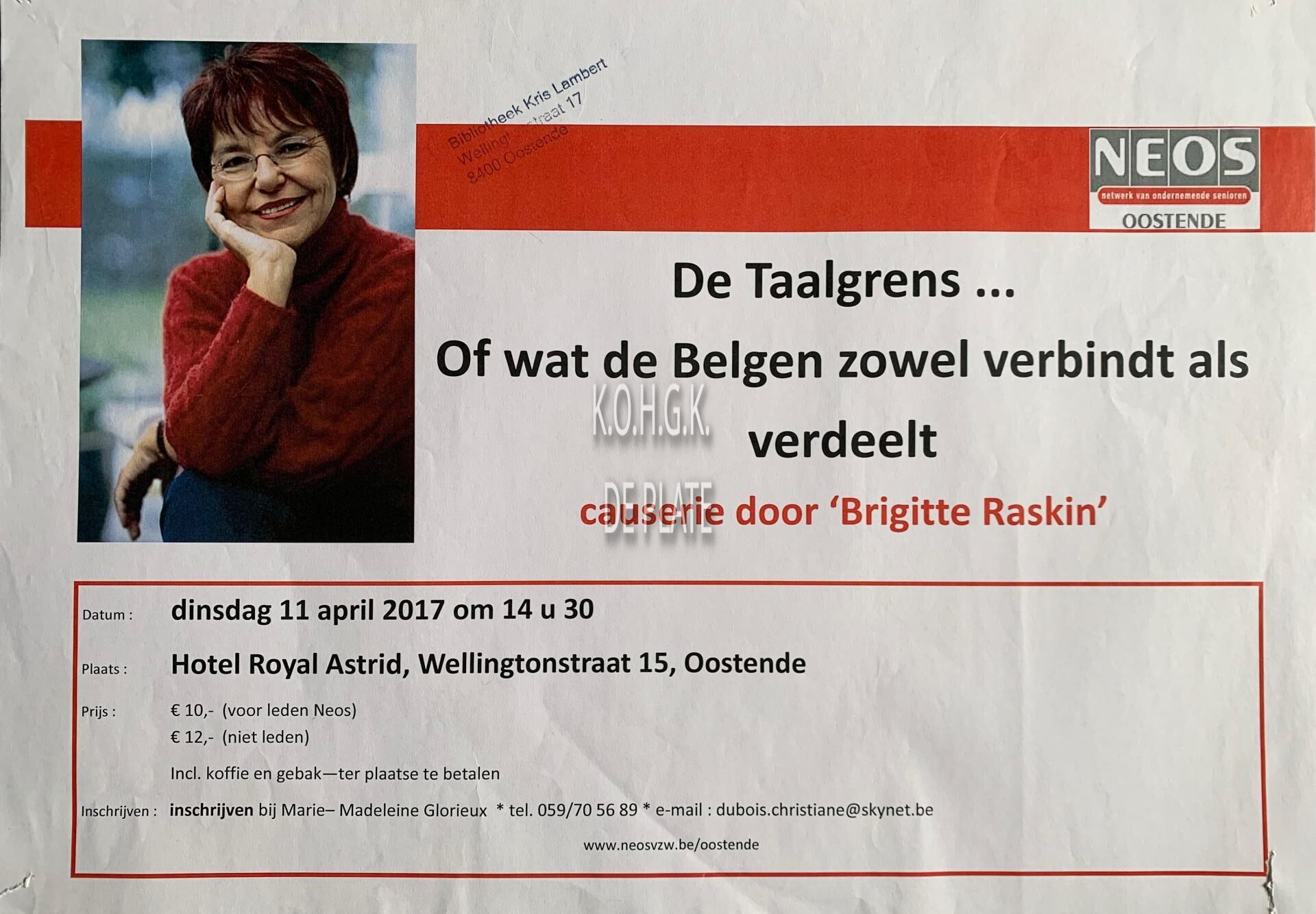 Omschrijving Formaat : 30 x 42 cm. - Causerie Trefwoorden NEOS (NETWERK VAN ONDERNEMENDE SENIOREN) AFFICHES VOORDRACHTEN RASKIN BRIGITTE (AUTEUR JOURNALISTE) HOTEL ROYAL ASTRID Plaatskenmerk ZOLDER 301 LKA/04/493/54/2017-04 Inventarisnummers 2020/0810 11/ 04/ 2017 Herkomst BIBLIOTHEEK KRIS LAMBERT Collectie Socio- Culturele Verenigingen Neos Print