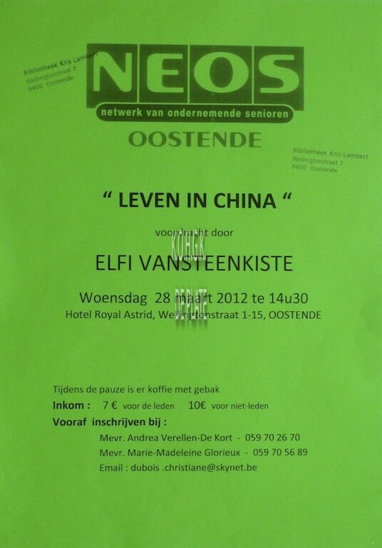 Affiche : NEOS. "Leven in China". Hotel Royal Astrid. 28 maart 2012.